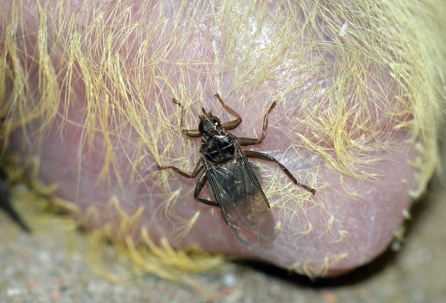 La mosca de las palomas está muy bien adaptada para vivir en las palomas. Se alimenta de la sangre de estas aves. La mosca hembra desarrolla en su interior a la larva en todos sus estadios, desde el huevo hasta casi la pupa. Cuando la larva está a punto, la deja en lugares frecuentados por palomas. En este otro posteo que escribí tiempo atrás, tienes más información: