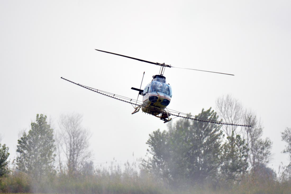 El todoterreno se acercó a la caseta y aparcó delante nuestro. Yo me acerqué al hombre de mediana edad y nos dijo que mejor nos pusiéramos detrás del coche agachados. Entonces dio a través de un walkie-talkie la orden de tratar. Se acercó el helicóptero y dejó caer una lluvia de producto. Vaya. Y yo sin mascarilla. Esto se lo hago a un cliente y Sanidad cierra la empresa en la que trabajo. Pero en fin, son cosas de los tratamientos fitosanitarios. Todo a lo grande. Nada más pasar el helicóptero, vimos que detrás nuestro, a pocos metros, venía una pareja de ciclistas. Se pararon en seco para protegerse de la nube de insecticida que les estaba cayendo. El hombre de mediana edad que estaba al mando del tratamiento no se había dado cuenta. Vaya. A mi mujer y a mí, no es que nos fuera mejor que a los ciclistas, pero de algo nos libramos. Lo bueno del caso es que hacía unos minutos que lloviznaba. Y al acabar de pasar el helicóptero se puso a llover. Suerte.