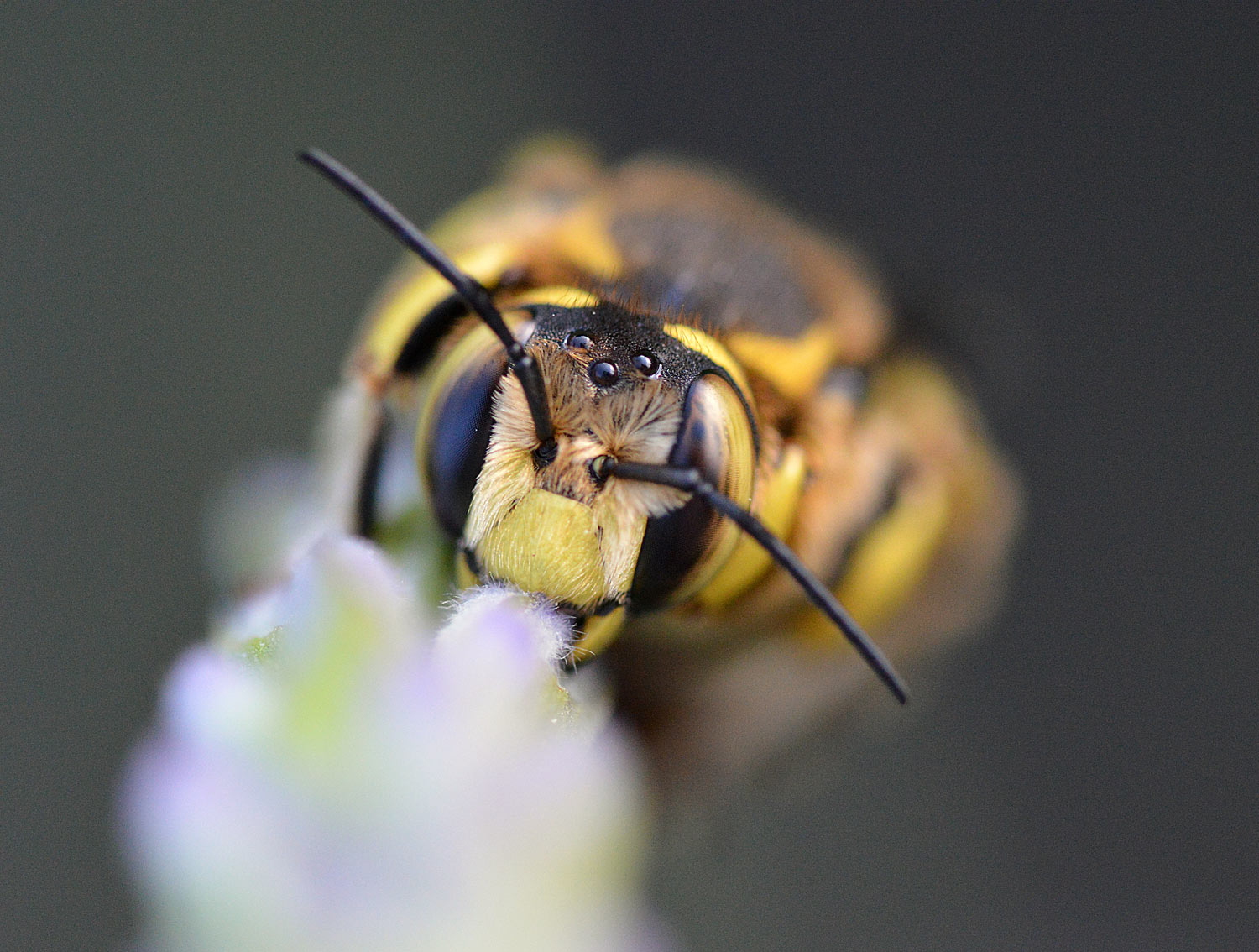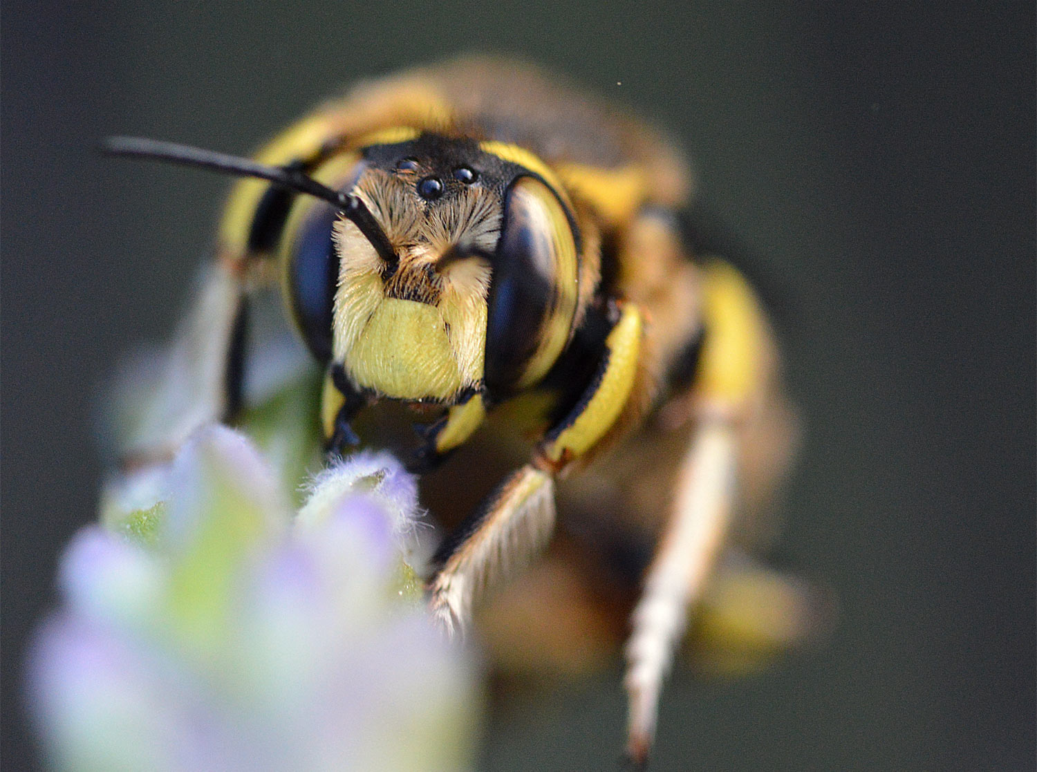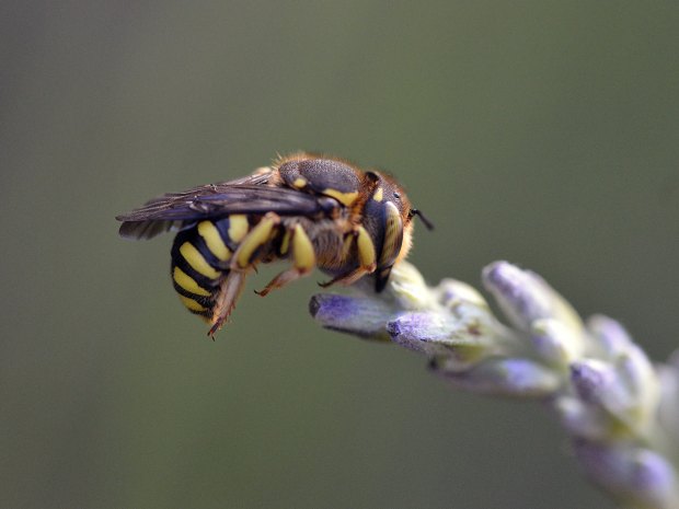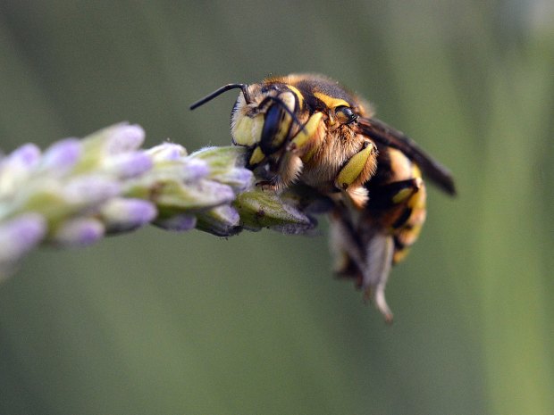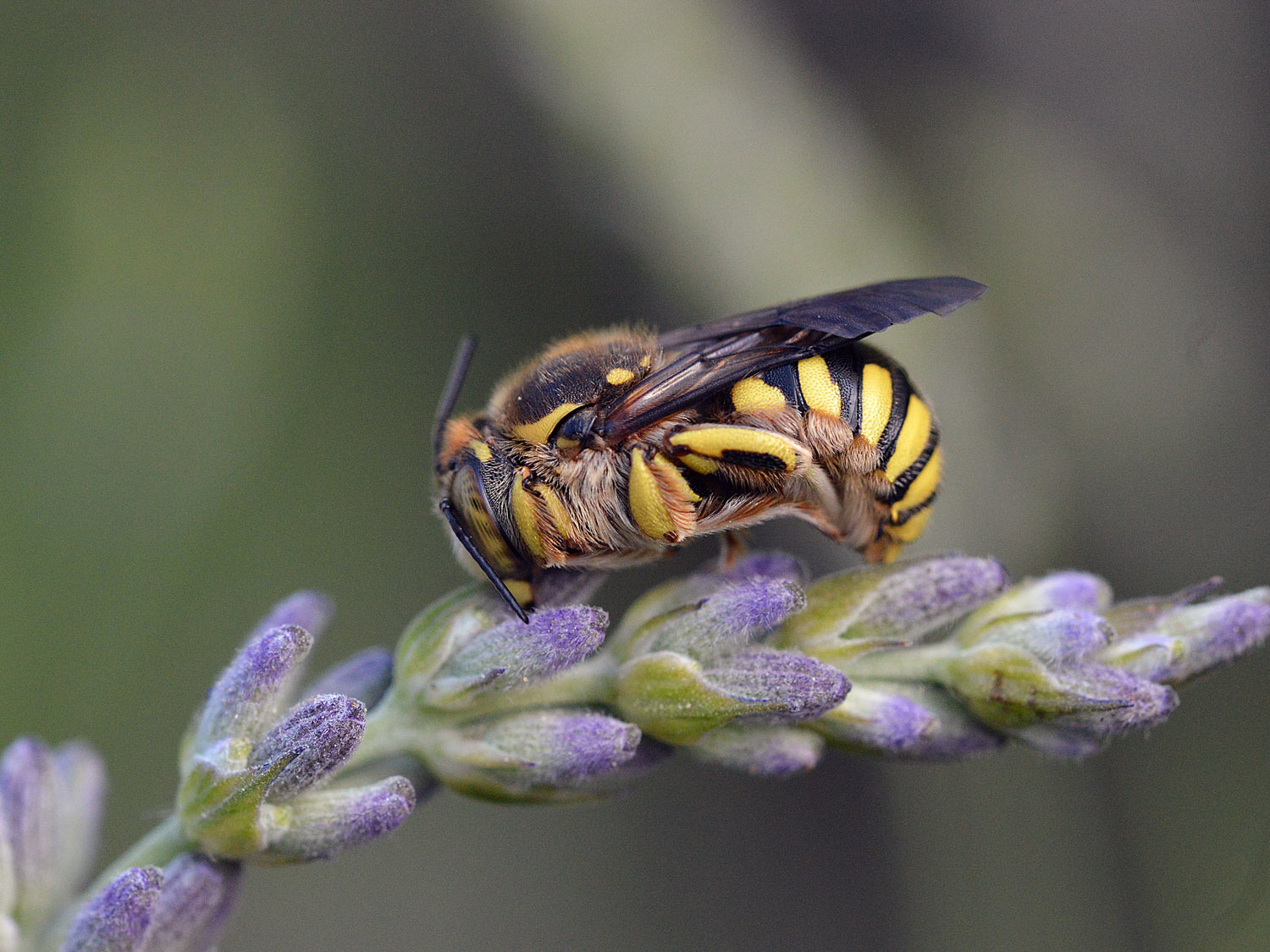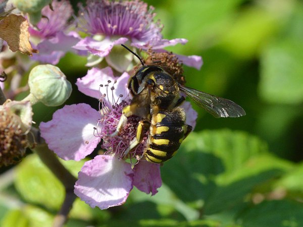 Una abeja común en verano en parques y jardines de la zona donde vivo es la abeja cardadora de lana (Anthidium florentinum). Ayer domingo aproveché para hacerle unas fotos sobre flores de zarzamora. Tiene unos colores llamativos y una forma robusta. Podría asustar este aspecto. Pero no nos va a hacer nada. Cada hembra tiene por delante un laborioso trabajo. Como otras abejas del mismo género se dedica a recoger fibras vegetales para construir una cámara donde depositar el huevo. Ya sea en el suelo, en una pared o en un hueco cualquiera, la hembra lleva fibras vegetales para recubrir la celdilla. En el centro de este suave receptáculo va depositando polen que, a diferencia de otras abejas, transporta bajo su abdomen. Cuando está todo listo, deposita un huevo sobre la comida. La larva tendrá provisiones para desarrollarse.