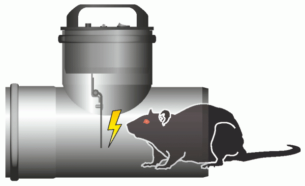 Algunos de los aparatos que han aparecido parecen más útiles que otros. Aprovecho esta entrada para mostrar el aparato Rat-Exx de la casa sueca Jafo AB [1]. La idea es conseguir la disuasión de los roedores para que no accedan a edificaciones a través del albañal. Esto se consigue insertando el aparato en esta conducción. Su funcionamiento es sencillo. Al tocar la rata una lengüeta de acero que tiene el dispositivo en su interior, esta recibe un impulso eléctricos de entre 200 y 500 voltios. Estos impulsos se generan en intervalos de dos por segundo. Esta descarga no letal disuade a la rata de adentrarse en el edificio.