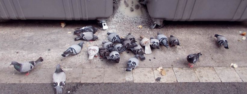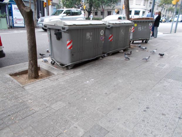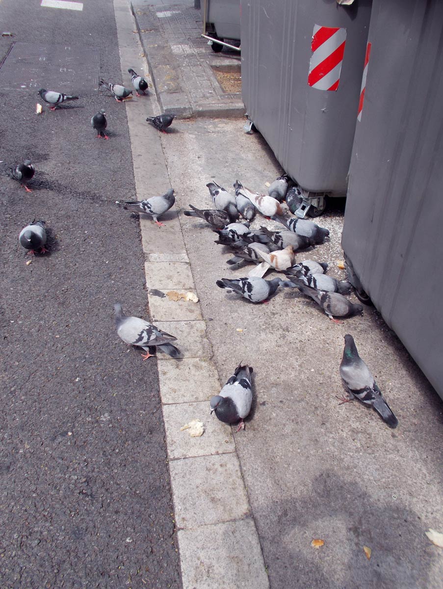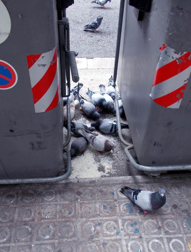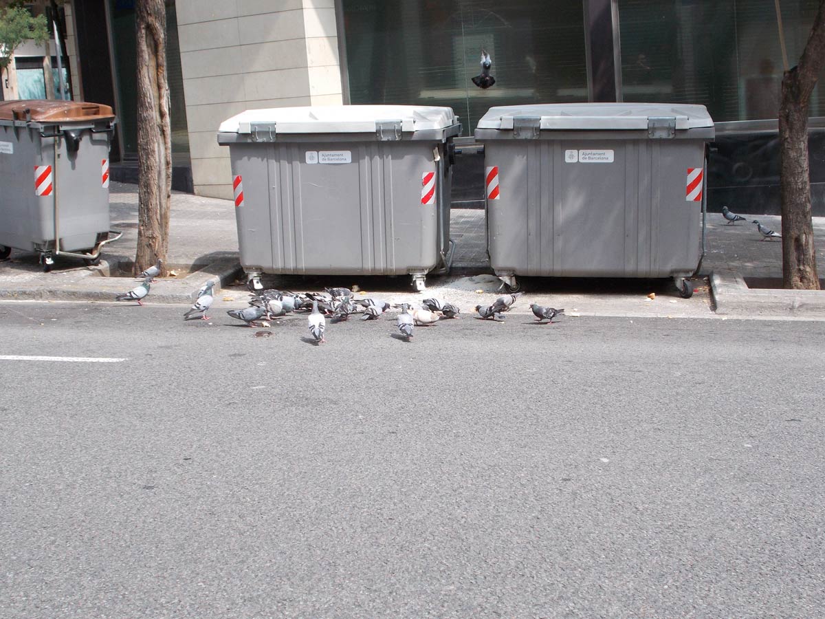 Este mediodía bajaba por la calle Muntaner de Barcelona. Iba hacia un cliente a realizar un tratamiento contra chinches, cuando he visto un grupo de paloma doméstica (Columba livia) cerca de un contenedor. Al ver la estampa, mis neuronas se han conectado entre sí y me han mandado un mensaje simple y llano: fotos. Umm. Bien pensado. Fotos. Sí. Fotos. Y rápidamente he echado el ancla en el carril de carga y descarga que queda a la izquierda de la calzada. He puesto los intermitentes en modo emergencia y he salido de la furgoneta rápidamente.