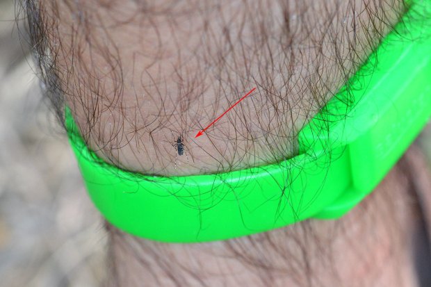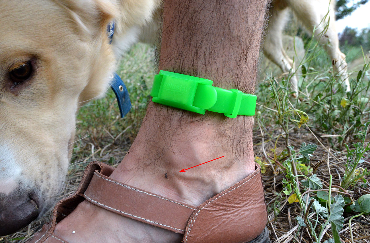 Lo primero que he hecho es esperar a que llegaran los mosquitos, lo cual ha sido rápido. No han sido necesarios ni 5 minutos y ya los tenía allí. He visto que las hembras estaban con ganas de chuparme la sangre. Me las he quitado de encima y he abierto la bolsa. Me he puesto la pulsera en el tobillo, puesto que los mosquitos tigre pican principalmente en las piernas. Nada más ponerme la pulsera, ya los tenía revoloteando. En las imágenes 2, 3 y 4 se puede ver que la pulsera no ejerce ningún efecto sobre los mosquitos. Con una flecha en rojo he señalado la posición del mosquito. En la imagen número 5, se pueden ver dos mosquitos posados. Hago constar que por hacer estas fotografías y muchas más, estos insectos me han comido las piernas.