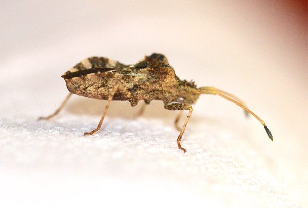 Entró en casa volando una chinche variegada, Centrocoris sp (Coreidae). Se posó sobre uno de los sofás de la salita. Mi mujer me avisó y cogí la cámara. Es una chinche muy particular por la cantidad de protuberancias que tiene en la cabeza y el pronoto. Un detalle bonito es que tiene dos espinas blancas en la parte posterior del pronoto que apuntan hacia el abdomen (figura 3). Se trata de un insecto que se alimenta de los jugos de las plantas. En la imagen número 6, se puede ver el largo aparato picador-succionador que usa para alimentarse.