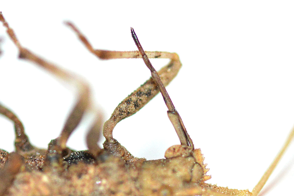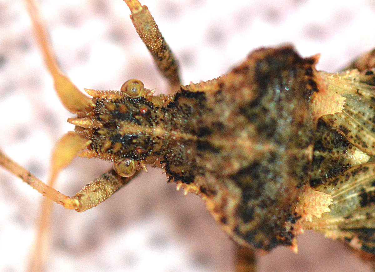 Entró en casa volando una chinche variegada, Centrocoris sp (Coreidae). Se posó sobre uno de los sofás de la salita. Mi mujer me avisó y cogí la cámara. Es una chinche muy particular por la cantidad de protuberancias que tiene en la cabeza y el pronoto. Un detalle bonito es que tiene dos espinas blancas en la parte posterior del pronoto que apuntan hacia el abdomen (figura 3). Se trata de un insecto que se alimenta de los jugos de las plantas. En la imagen número 6, se puede ver el largo aparato picador-succionador que usa para alimentarse.
