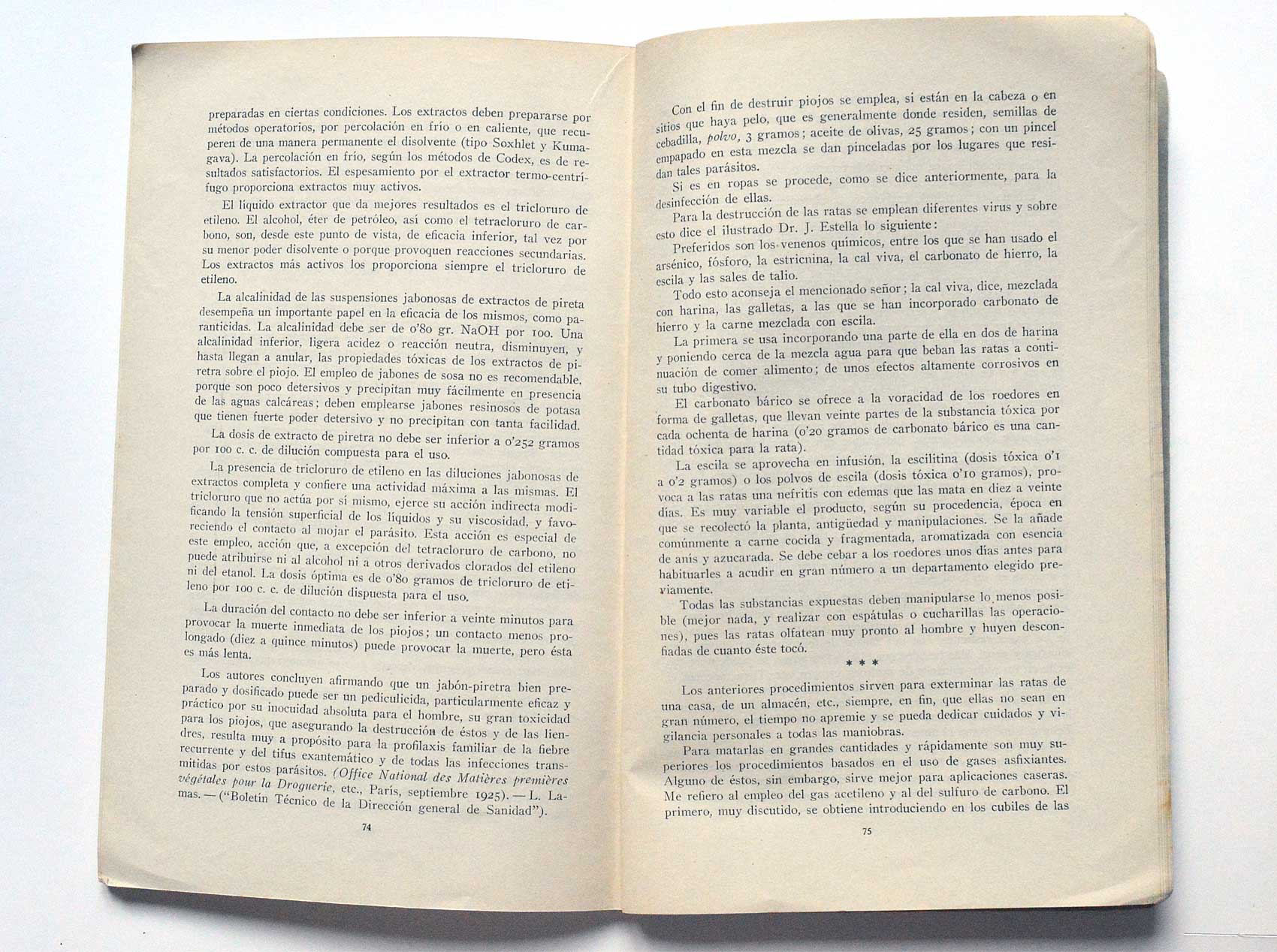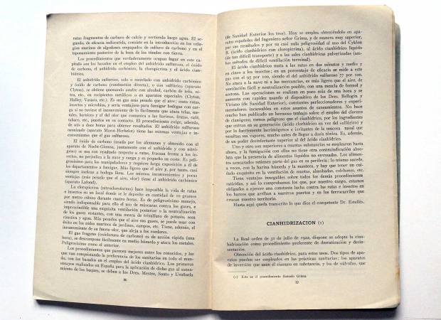 Es interesante la lectura de la parte dedicada a la desinsectación y desratización para hacerse una idea de los productos usados en la época. Sobre los productos para desinsectación se mencionan los polvos Pereat, Eclair y Daisy, las tiras Aeroxon y Orion, y los conos Zampironi. A estos productos he dedicado entradas. También se describen algunas fórmulas para control de moscas, mosquitos, chinches y piojos. Para el exterminio de ratas, se mencionan los cebos a base de virus y venenos químicos como cal viva mezclada con harina, las galletas con carbonato bárico y la carne mezclada con escila. Todo ello para eliminar ratas cuando la población es baja. Pero cuando es alta se recomienda el uso de gases asfixiantes como gas acetileno, sulfuro de carbono, anhídrido sulfuroso, monóxido de carbono, anhídrido carbónico, oxicluro de de carbono (gas fosgeno), cloropicrina y ácido cianhídrico. Merece mi atención la mención al monóxido de carbono, porque tuvo un uso escaso. Se explica que era usado por los alemanes y obtenido mediante el aparto Nocht-Giemsa. Se afirma que es eficaz con las ratas, pero no con los insectos. También se dice que es muy peligroso dada su gran toxicidad. Sin embargo, el método al que se dedica más espacio es a la cianhidrización [3], ya que en aquella época era muy utilizado en España para desratizar y desinsectar barcos, trenes y grandes almacenes.