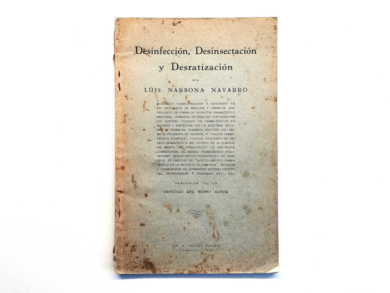 – Luis Narbona Navarro. 1933. Desinfección, desinsectación y desratización. Tip. E. Berdejo Casañal, Zaragoza. 84 pp. 21’5 x 14 cm.