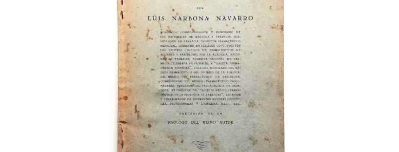 Luis Narbona Navarro (1864-1940) fue un destacado farmacéutico aragonés [4]. Una eminencia de la época que hizo mucho por dignificar la figura del farmacéutico. Parece ser que consiguió que el farmacéutico pudiera desempeñar un papel más amplio dentro del cuerpo de funcionarios de sanidad. Luis Narbona fue una persona activa. Fue miembro de diversas instituciones y se prodigó en diversas obras con la publicación de libros y artículos en revistas científicas. Algunos de los libros fueron, por lo que parece, autoediciones como es el caso del presente texto.