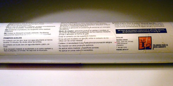 El titular del registro de TRX Gel Cucarachas es Sharda Cropchem España [2], la cual tiene registrados cuatro geles en España a base de imidacloprida. Tiene, por ejemplo, otro gel que comercializa DTS Oabe llamado Defens Gel Cucarachas. Y también es titular del gel Imidasect (núm. de reg. 13-30-06662) que tiene Biocides Solutions en su catálogo. Sharda Spain, junto con Bayer CropSciences y Mylva son las únicas compañías que tienen registrada la imidacloprida en España. Me pregunto por qué DTS Oabe usa un producto registrado por Sharda Spain cuando tiene, por ejemplo, Dobol Gel Pro con acetamiprida al 2%. Quiero decir que para qué pagar a otros, cuando podrían haber desarrollado su propio gel para alcantarillado.