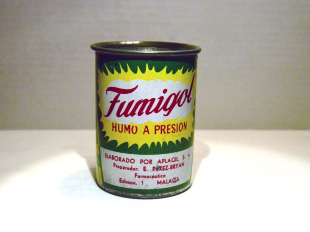 He adquirido un bote antiguo de Fumigol de finales de la década de 1950. En la etiqueta se puede leer el número y el año del registro: «Reg. en la D. G. Sanidad con el Núm. E. N. 28016 Fecha 30-7-57» (figura 3).
