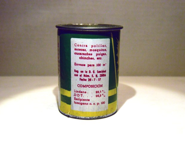La composición de este fumígeno es a base de lindano al 28’5% y DDT al 28’5% (figura 3). Es curioso que sea la misma cantidad para ambas materais activas. La composición con estos dos organoclorados era común en la época en productos insecticidas para el campo y para uso doméstico [1]. En aquella época había otros fumígenos para doméstico muy utilizado como los papeles fumígenos [2]. Consistían en un papel impregnado con lindano que se quemaba para librar una habitación de insectos.