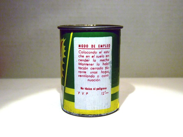 El bote es de pequeño tamaño y parece que estaba preparado para desinsectar un pequeño local o habitación. Se indica un espacio de 100 m3 (figura 3). En el modo de empleo se dice: «Colocando el estuche en el suelo encender la mecha. Mantener la habitación cerrada durante unas horas ventilando a continuación» (figura 4).