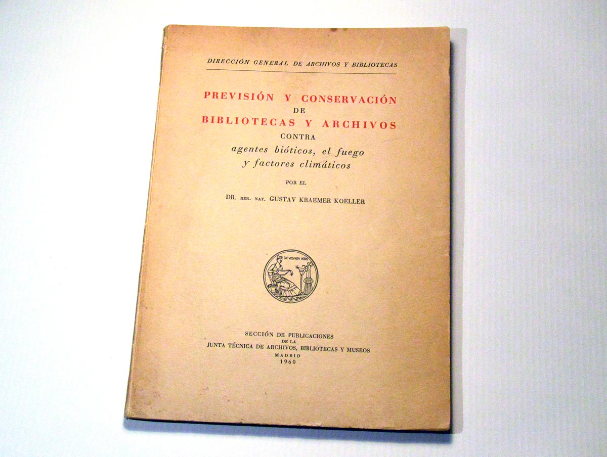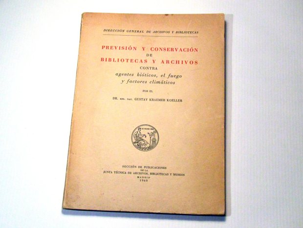 Fig 1. Portada de ‘Previsión y conservación de bibliotecas y archivos contra agentes bióticos, el fuego y factores climáticos’ de Gustav Kraemer Koeller publicado en 1960./ C. Pradera 11-2014