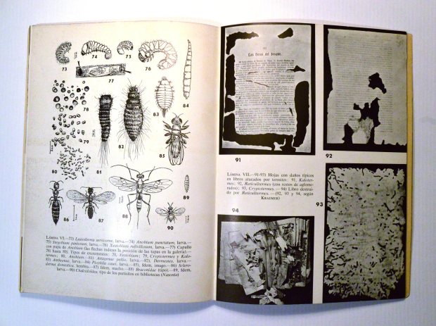 Hace poco compré otro libro de Gustav Kraemer titulado ‘Previsión y conservación de bibliotecas y archivos contra agentes bióticos, el fuego y factores climáticos’. Muy interesante su temática ya que está relacionada también con la conservación de la madera. En las imágenes 2 y 3 se puede ven el índice del libro. En sus 103 páginas se desgranan los principales agentes que amenazan la integridad de los libros y la manera de prevenirlos. Es un libro, lógicamente, superado. Aunque no por ello resulta interesante de consultar por todos los datos que contiene. Y más interesante es si el añado mi afán de bibliófilo. Me encantan los viejos libros. En las imágenes 4 y 5 se pueden ver la calidad de las láminas que acompañan al texto. Los dibujos de los insectos son preciosos.