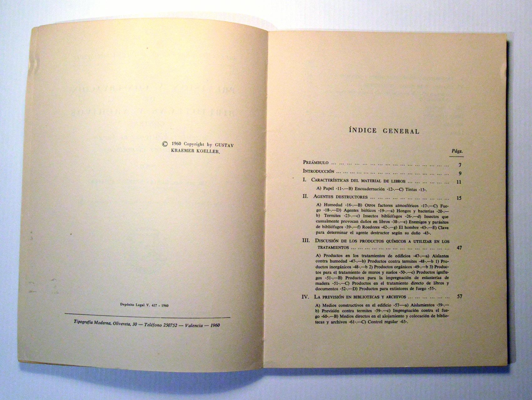 – Gustav Kraemer Koeller. 1960. Previsión y conservación de bibliotecas y archivos contra agentes bióticos, el fuego y factores climáticos. Sección de Publicaciones de la Junta Técnica de Archivos, Bibliotecas y Museos, Madrid. 103 pp. Depósito Legal V-457-1960.