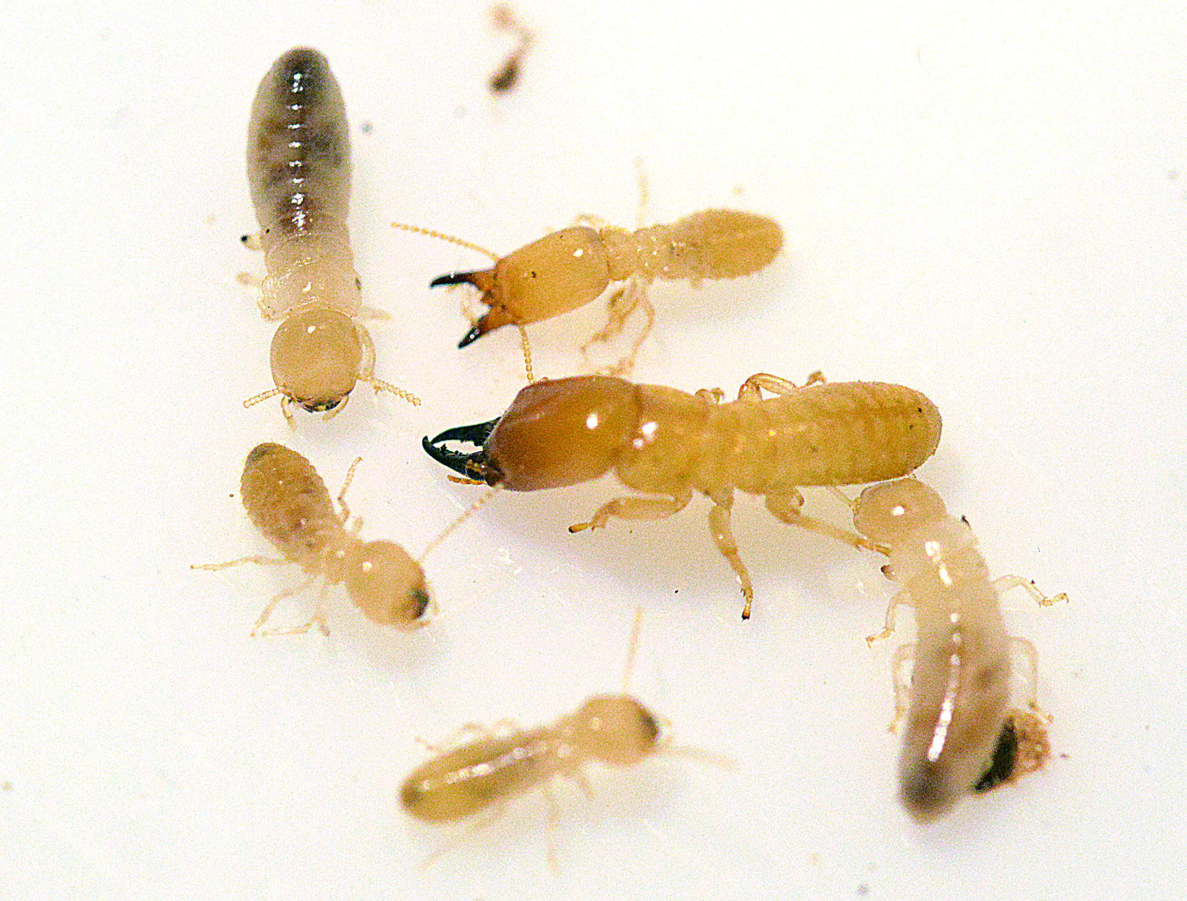 Recogí una muestra de ambos géneros y en casa tomé unas fotografías. En la imagen número 4, se pueden ver juntas obreras y soldados de ambos géneros. Para diferenciarlas, hay que tener en cuenta que las termitas subterráneas son más pequeñas que las termitas de la madera seca. Aunque esto a veces no se aprecia. Sin embargo, lo que sí se puede observar a simple vista es el grosor del tórax. En la termita subterránea el tórax es más estrecho que la cabeza y el abdomen. En cambio, en la termita de la madera seca, el tórax es tan ancho como la cabeza y el abdomen. Espero que las fotografías permitan apreciar bien las diferencias.