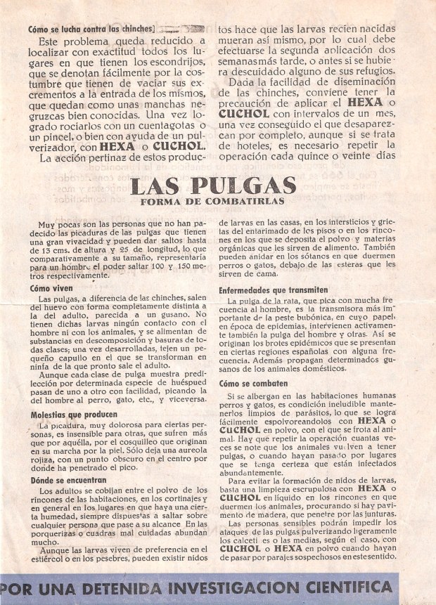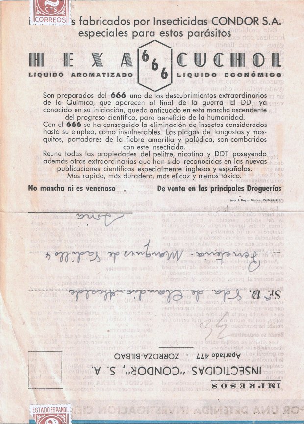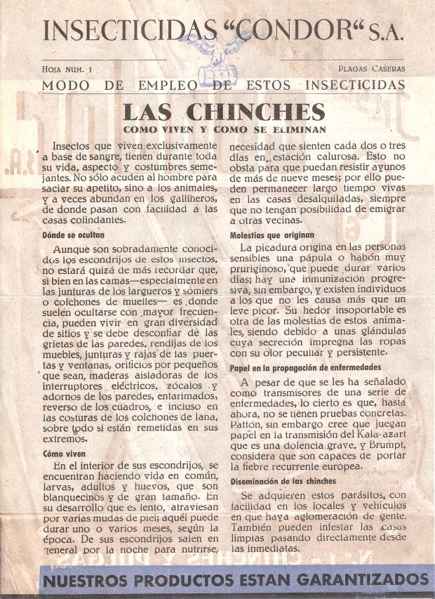 Recientemente he adquirido un folleto publicitario de la compañía Insecticidas Cóndor SA que explica de manera sucinta cómo eliminar chinches de cama y pulgas. Este folleto tiene un tamaño 16 x 22 centímetros y consta de cuatro páginas que se pueden ver reproducido en esta entrada (figuras 1 a 4). Si tuviera que fechar este documento sería entre 1945 y 1950. Daré detalle de mi conjetura.