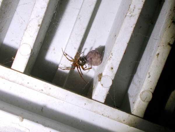 Posiblemente se trate de ejemplares de Steatoda grossa. Lo cierto es que no recogí ningún ejemplar para asegurarme. A estas arañas les tengo un poco de respeto porque muerden. A la S. grossa se le conoce como falsa viuda negra, precisamente debido a su picadura. Aunque hay que decir que no son agresivas. Si pican es porque se sienten amenazadas. Además no tienen una visión muy buena. Cosa lógica porque viven escondidas en lugares oscuros. Como se puede observar, teje una telaraña irregular.