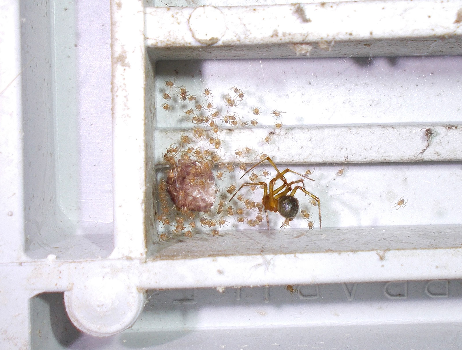 He dedicado algunos posteos a las arañas del género Steatoda. Para mí son sencillamente fantásticas. En lo que llevo observado, diría que las de este género son las más abundantes en el interior de las casas. No sé si esto sucede en otras partes. Me sorprenden por su capacidad para instalarse en cualquier lugar donde nosotros las dejemos tranquilas. Cualquiera que tenga la paciencia de buscar arañas en su casa las encontrará. Hace unos días levanté una tapa de registro de aguas residuales en un lavabo y quedé maravillado. Allí dentro, había unas cuantas arañas adultas de Steatoda. Me entretuve un rato en observarlas.
