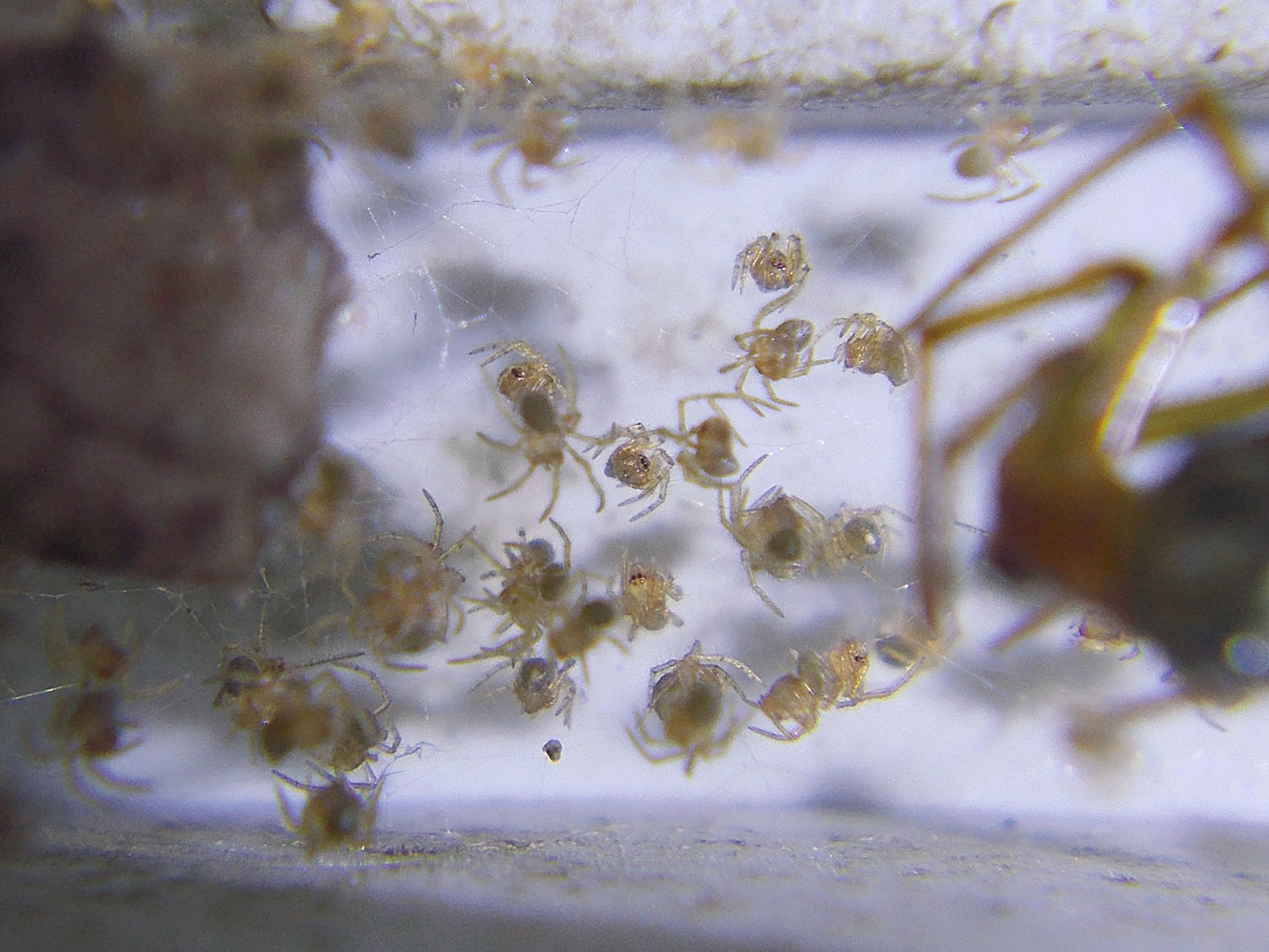 Primero me fijé en las arañas que habían tejido su tela aprovechando las esquinas de obra de las arquetas. Luego vi que, justo bajo la tapa, había un par de hembras que habían hecho el capullo que arropa la puesta de huevos. Me fijé en la araña de la imagen número 2 y vi lo bonito de este saco tejido en resistente seda. Luego vi que había una araña rodeada de minúsculas arañitas (imagen 3). Intenté hacer unas fotos lo mejor posible. Hasta usé la lupa de bolsillo para intentar una toma macro sin mucho éxito (imagen 4). Mientras editaba las fotografías me puse a contar las arañitas y me salió el número de 102. Vaya. Y creo que me quedo un poco corto, pues seguramente me dejé alguna. Puede que detrás del saco se escondiera alguna.