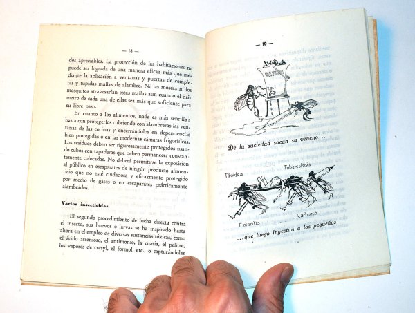 Hace unas semanas, cayó en mis manos un folleto de divulgación publicado en 1945 por la Dirección General de Sanidad. Antes de empezar su lectura, pensé que sería una obra interesante. Pero, a medida que leía, me fui desencantando. El libro consta de 32 páginas en los que no se entra en profundidad en las diversas especies que pueden tener incidencia sanitaria ni en su biología. En cuanto a los medios de control, a los que se dedica poco espacio, tampoco se dan grandes remedios. Estos se resumen en tres: limpieza, métodos físicos e insecticidas (pulverizaciones o cebos). De los cuales, se remarca que la limpieza es el más importante. Básico.