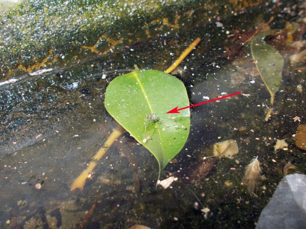 He levantado la tapa y he observado en su interior (figura 2). Estaba lleno de hojas y otra materia vegetal. Esto es algo que agradece el mosquito tigre. Entonces he visto un mosquito tigre adulto sobre la superficie del agua. Lo he tocado con la punta del dedo y no ha alzado el vuelto, cosa lógica porque hacía frío. Le he hecho algunas fotografías (figura 3 y 4). Luego he recogido una pequeña muestra (figura 5). Había una navícula, probablemente de Culex pipiens, y también larvas y pupas de Aedes albopictus. Esta mañana iba con mi compañero Carles Fortea quien llevaba en su furgoneta un termómetro digital. Así que he podido tomar la temperatura del agua. Como se puede ver en las imágenes, esta era de 10 ºC.