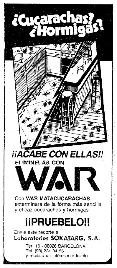 Como se puede leer, War Matacurachas fue formulado con pelitre al 0’2%. Cada sobre pesaba 7 gramos y costaba 25 pesetas (i.i.). Entiendo que estas iniciales hacen referencia a impuestos incluidos. Claro que también puede entenderse como IVA incluido. Agradecería a alguien que me aclarara el misterio, puesto que si se refiere al IVA, el sobre se podría fechar como posterior a 1986, año en que fue introducido este impuesto en España. Ahora bien, War Matacucarachas podría haberse lanzado al mercado ese año o poco antes. Esto lo deduzco porque he encontrado tan solo un anuncio que fue publicado en el periódico ABC en abril de 1986 (figura 3).