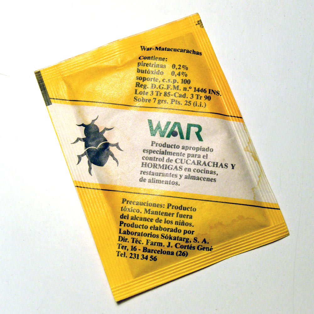 Esta mañana un compañero me ha regalado un viejo sobre de insecticida. Me ha dicho que me iba a gustar. En efecto, me ha gustado. A medida que lo iba observando me he ido maravillando. War Matacucarachas. Bélico nombre. En las imágenes se puede ver el anverso y el reverso. El sobre mide 9 centímetros de largo por 6’5 de ancho. Tiene un diseño ochentero. No tiene desperdicio. En el anverso se puede leer el modo de empleo donde indica que debe esparcirse «antes de la noche». No recuerdo que en algún insecticida especificara algo parecido. En el reverso aparecen más datos. Interesante el dibujo de la cucaracha. Hay muchas maneras de representar una cucaracha. Creo que esta es de las más feas que he visto.