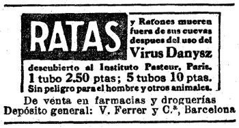 El Virus Danysz fue el primer raticida de esta clase. Y sería, por tanto, el primer raticida en usar bacterias. Un raticida biológico en toda regla, junto a otros raticidas de origen vegetal como la cebolla albarrana. Detrás de este producto, muchos otros aparecieron. El Virus Danysz ya que fue desarrollado por el biólogo Jean Danysz (1860-1928) del prestigioso Instituto Pasteur de París. Hubo otras marcas importantes como, por ejemplo, la Solución de Loeffler en Alemania, el Ratin 1 en Dinamarca, el Liverpool Virus en el Reino Unido y el Azoa Rat Virus en los Estados Unidos [2]. Por supuesto, habrá otras marcas comerciales comercializadas en otros países que desconozco, pero estas son las más importantes. En España tengo constancia de tres productos comercializados. La más importante, como ya he comentado, fue el Virus Danysz. Luego había un preparado del Instituto Nacional de Higiene de Alfonso XIII de Madrid bajo el nombre de Muricida. Y también fue vendido el Raticida Claramunt fabricado por el Instituto Claramunt de Barcelona. Todos los raticidas gozaron al principio de gran prestigio y en ellos se pusieron muchas esperanzas, pero con el tiempo llegaron los problemas.