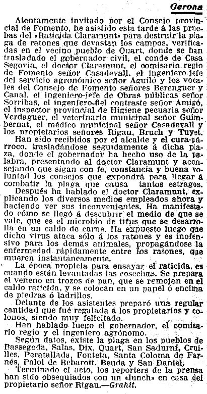 El segundo es el Raticida Claramunt del que sí he encontrado más información. En septiembre de 1914, en ‘La Vanguardia’, fue publicada una noticia donde se explica que responsables de la Administración asistieron al pueblo de Quart (Girona) donde se iba a utilizar el Raticida Claramunt, ya que había una importante plaga de ratones que estaban «devastando los campos» (figura 5). Esta prueba se llevó a cabo bajo la dirección del doctor Claramunt. En 1921, aparece un anuncio a toda página en una revista de medicina donde aparecen los productos comerciales del Instituto Claramunt y entre ellos el Raticida Claramunt (figura 6). Se dice que sirve «para destruir las ratas, los ratones, los topos, y en general todas las especies y variedades del género Mus». El responsable del Instituto Claramunt no es otro que Lluís Claramunt Furest (1862-1935), también responsable del Instituto Municipal de Higiene de Barcelona y, por tanto, de la desratización de la ciudad hasta su fallecimiento.