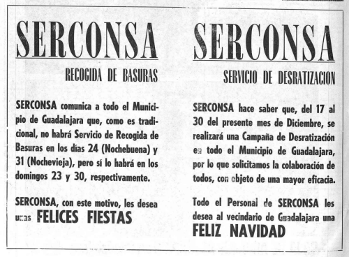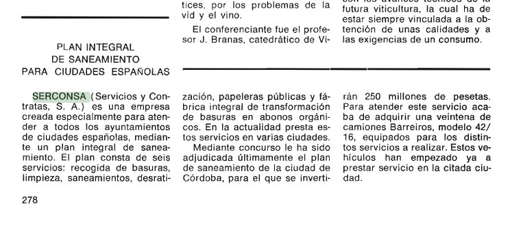 Parece ser que en aquellos años surgió la idea de un plan integral de ingeniería sanitaria. En 1970 entró a dar servicios en Córdoba. En la imagen número 2, se puede ver un anuncio publicitario publicado a toda página en el periódico ABC donde se muestra la potencia de salida de esta empresa y se detalla el plan integral. Era un planteamiento novedoso y SERCONSA se hizo con las contratas de limpieza que pudo. En 1973 prestaba servicios en 21 ciudades españolas. Entre estas estaban Córdoba, Granada, Marbella, Fuengirola, Guadalajara, Sabadell, Sant Boi de Llobregat o Santa Coloma de Gramenet. La década de 1970 fue importante para esta empresa. Creo que la de 1980 no tanto. De la misma manera que desconozco cuándo empezó su actividad, también desconozco cuando la finalizó. Quizás la comprara otra empresa más grande para hacerse con las contratas que ostentaba.