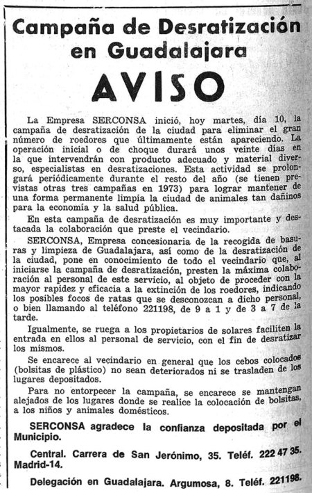 Otro aspecto es saber qué materia activa usaba SERCONSA en las desratizaciones. En un artículo publicado en la revista Flores y Abejas en marzo de 1976 se explica que se usan anticoagulantes [3]. En concreto, se usaba warfarina. En este artículo aparece algún dato interesante como que en la campaña de 1974 fueron empleados la nada despreciable cantidad de 3.258 kilos. Esto era habitual, ya que la dosis letal por warfarina se adquiere por ingesta de cebo durante varios días [4]. Y además en aquella época había muchas más ratas que hoy en día. El censo de 1970 para la ciudad de Guadalajara era entonces de 31.917 habitantes [5]. Para la desratización se contaba con 7 personas más una furgoneta.
