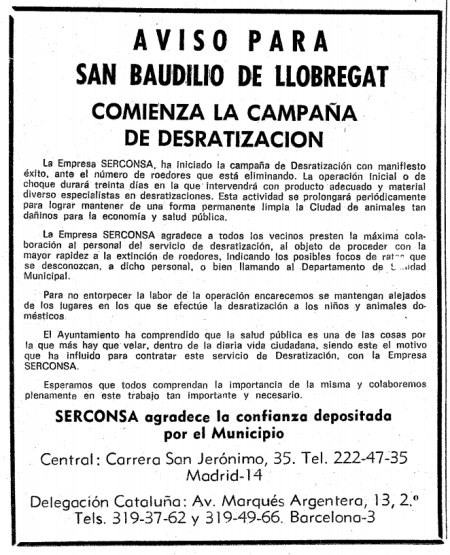 En esta entrada pongo algunas reproducciones de anuncios aparecidos en los periódicos de la época. En la parte superior (figura 1), hay un anuncio donde SERCONSA informa a los vecinos de Sant Boi de Llobregat (Barcelona) para que sepan que se va a realizar la campaña de desratización y colaboren. En las hemerotecas, de donde más información hay sobre SERCONSA es en relación a las poblaciones de Córdoba y Guadalajara.