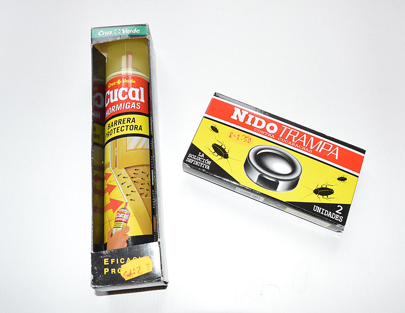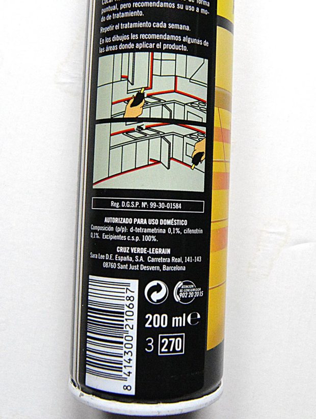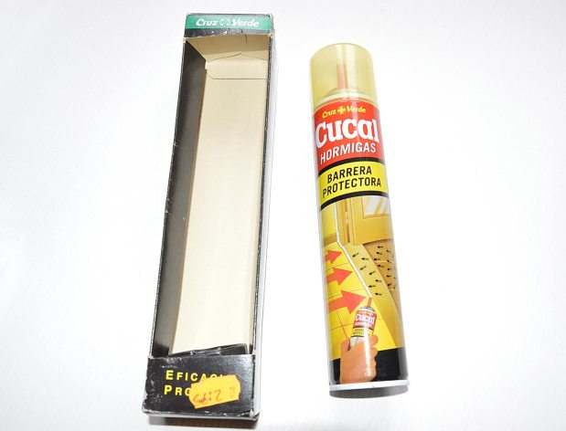 Hace unas semanas entré en un todo a cien situado en el barrio de la Florida de Hospitalet de Llobregat, Barcelona. Estaba esperando a un cliente y me sentí atraído por el local viejo y desaliñado. En la caja había una mujer de origen paquistaní. O quizás fuera hindú. No sé. Entré por ver qué productos contra plagas tenían a la venta. En una estantería de la esquina destacaban los botes de aerosol. Estuve mirando qué marcas tenían y me encontré con una sorpresa, un bote de Cucal Hormigas de Cruz Verde. Desconocía la existencia de este producto. Lo cogí y busqué en su etiqueta el número de registro. Este era 99-30-01584. Bien, 10 años caducado. Pero de esto no creo que entendiera la mujer que estaba en la caja. Un detalle interesante es que el bote estaba dentro de lo que parece una envoltorio promocional. Sospeché que fuera un bote de las primeras hornadas y que llevaría un buen cacho de años en la estantería.