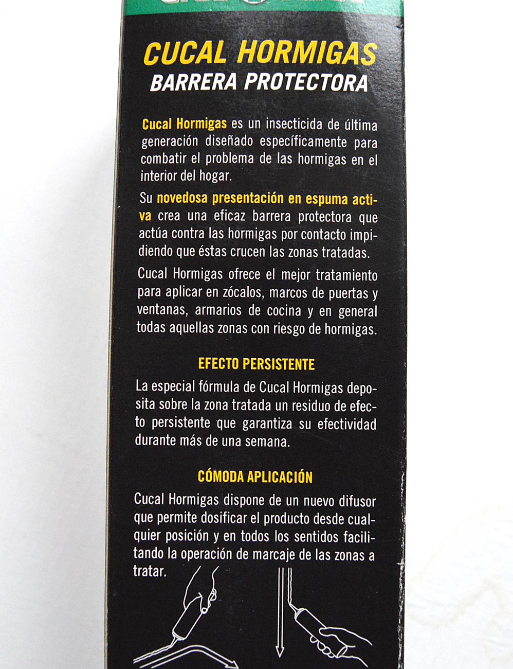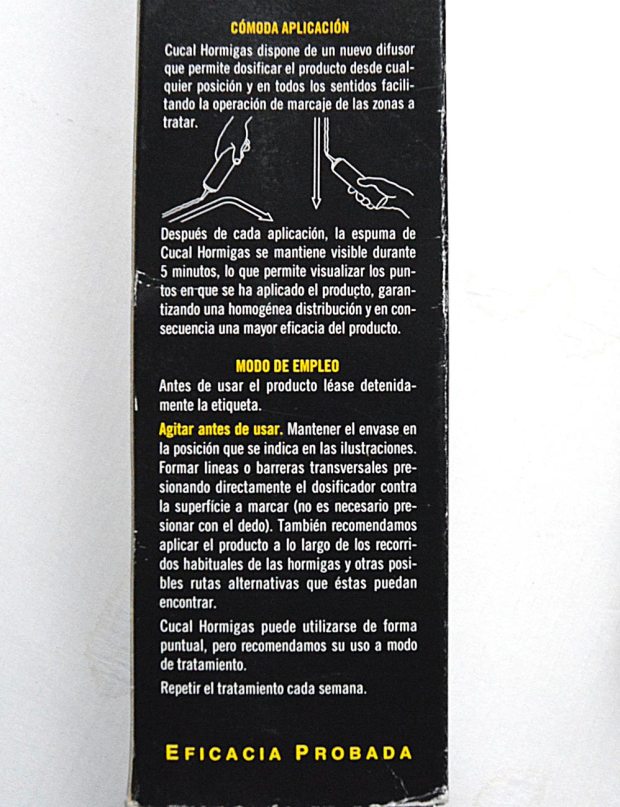 Cucal Hormigas es un producto interesante, ya que se trata de una formulación en espuma ideada para crear barreras protectoras. Ha habido pocos productos de este tipo de formulación. En España tan solo tengo constancia de Cucal Hormigas y de Raid Controller Espuma Insecticida al que dediqué hace unos meses una entrada. El primero en aparecer fue Raid Controller en 1995. Seguramente Cruz Verde lanzó su producto imitando el de SC Johson, su más importante competidor. Creo que ambos productos no tuvieron mucho éxito. Dejando a parte la residualidad y eficacia insecticida que tuvieran, no creo que al consumidor agradara mucho su aplicación. Como se puede ver en la imagen número 2, al aplicar Cucal Hormigas deja una banda espumosa y visible. No da la sensación de limpio si lo comparamos con una laca insecticida. He de comentar que el envase de Cruz Verde fue mejor diseñado que el de SC Johson, ya que este requería de una cánula que había que insertar para su aplicación. Para aplicar Cucal Hormigas tan solo hay que contactar el extremo del difusor contra la superficie a tratar y presionar ligeramente. Un envase novedoso y práctico.