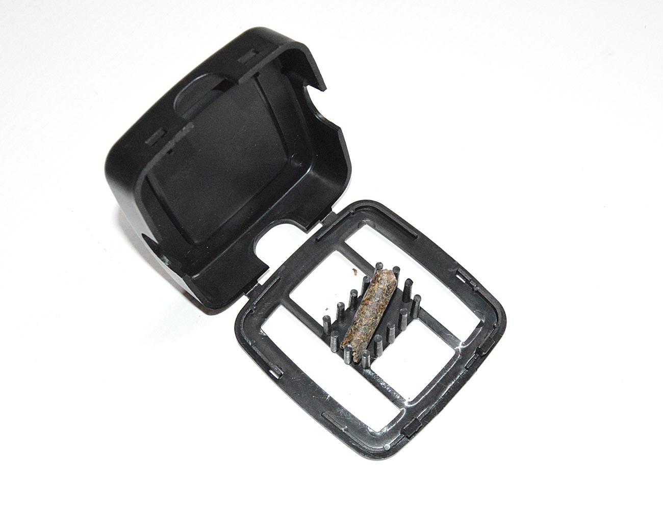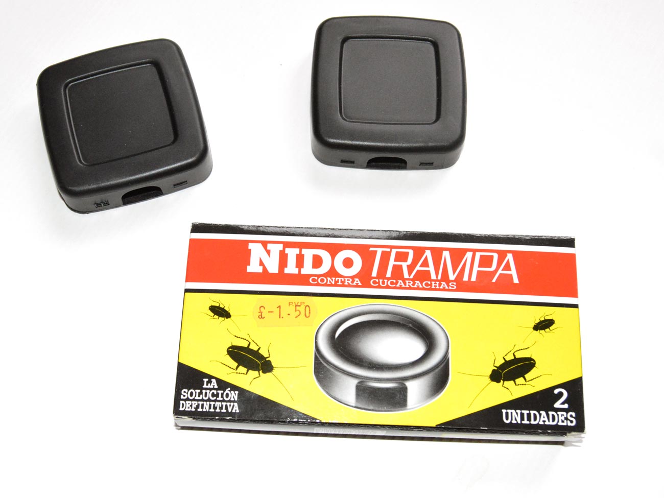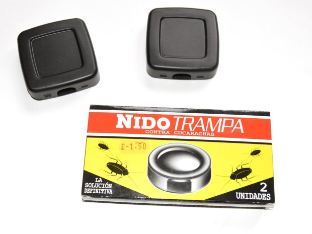 En las estanterías del todo a cien también encontré otros productos interesantes. Destaco las trampas Nido contra cucarachas que comercializa Ambientes Ama Hogar SL de Banyeres de Mariola, Alicante. Como se ve en la imagen número 7, se trata de una caja de plástico con un fondo de pegamento. Las cucarachas son atraídas y allí se quedan prendidas. En principio nada tienen de especial, aunque se publicitan como «la solución definitiva contra las cucarachas». Entiendo que las cucarachas se deben sentir poderosamente atraídas por la pastilla atrayente que hay en el interior (figura 8). A mí me recuerda a comida para mascotas. No huele. Quizás se trate de ingrediente secreto inodoro desarrollado por algún departamento de I+D con el cual se impregna la pastilla. Quizás estas trampas atraigan más que las desarrolladas por AgriSense. Poderosa competencia. Intentaré convencer a mi jefe para usarlas en nuestros clientes. En un par de meses acabaremos con todas las cucarachas y nos quedará tiempo para arañar los clientes de otras empresas de control de plagas. Fabuloso.