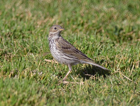 Con la llegada del frío unas aves se van y otras llegan. Entre las que llegan está la bisbiba pratense, Anthus pratensis, también adjetivada como común. Es un privilegio vivir en la Península Ibérica, pues es lugar de paso para muchas aves. La bisbita llega del norte de Europa para pasar los rigores del invierno. Busca lugares húmedos y con hierba. Yo la encuentro en el parque fluvial del Río Besós picoteando entre el césped. Allí he tomado las fotografías que acompañan a este posteo. Y aunque es fácil observarla porque abunda sobre el césped, no es fácil hacerle una buena foto. Es asustadiza y de pequeño tamaño, de unos 14 centímetros.