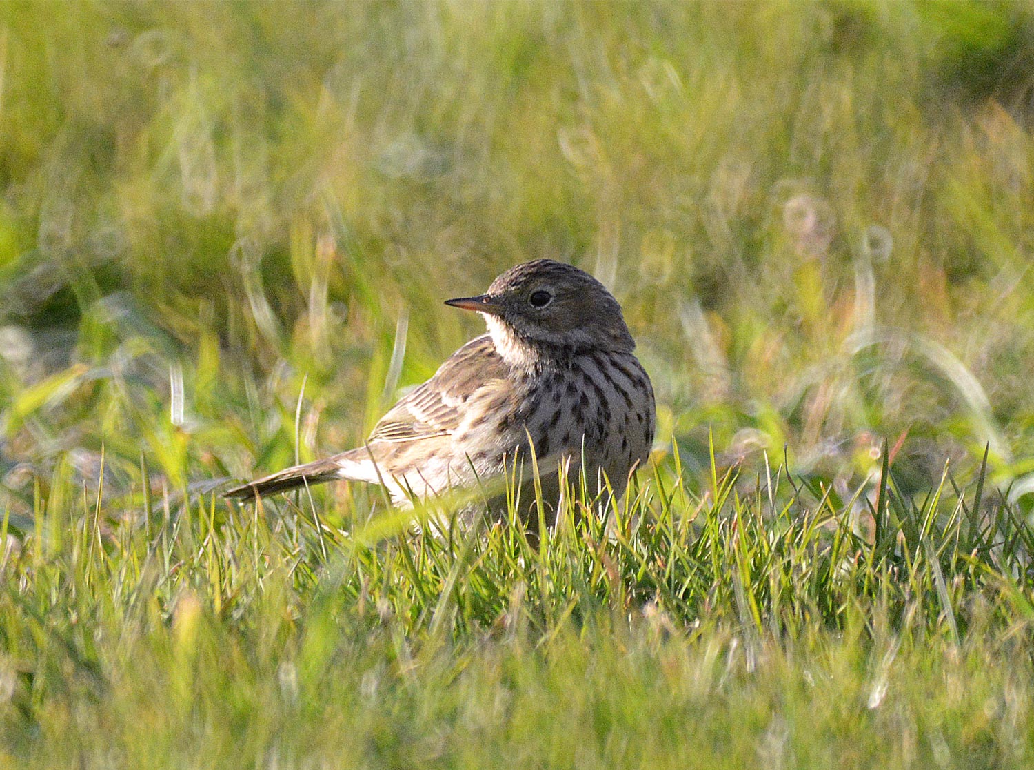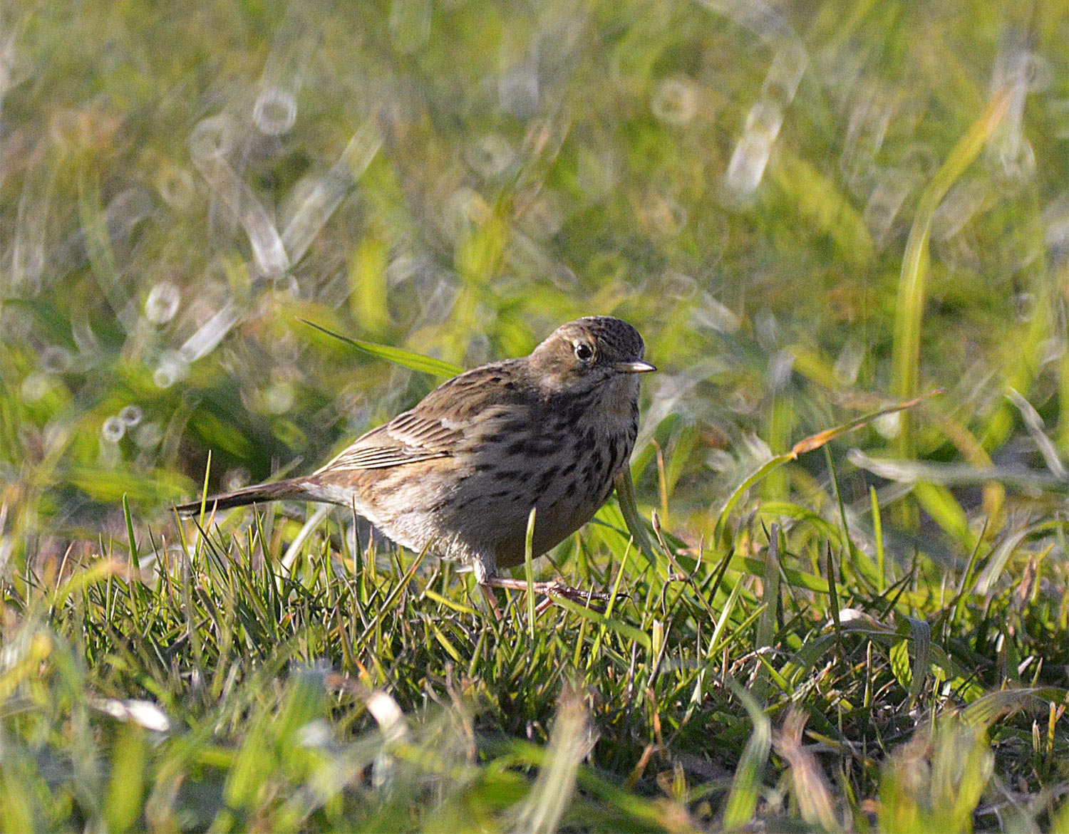 Con la llegada del frío unas aves se van y otras llegan. Entre las que llegan está la bisbiba pratense, Anthus pratensis, también adjetivada como común. Es un privilegio vivir en la Península Ibérica, pues es lugar de paso para muchas aves. La bisbita llega del norte de Europa para pasar los rigores del invierno. Busca lugares húmedos y con hierba. Yo la encuentro en el parque fluvial del Río Besós picoteando entre el césped. Allí he tomado las fotografías que acompañan a este posteo. Y aunque es fácil observarla porque abunda sobre el césped, no es fácil hacerle una buena foto. Es asustadiza y de pequeño tamaño, de unos 14 centímetros.