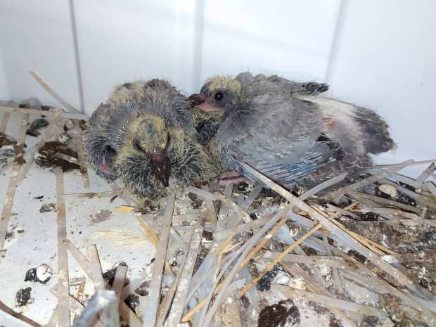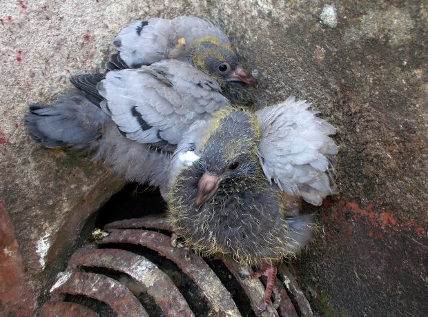 La paloma bravía (Columba livia) tiene su principal período de cría de marzo a mayo en esta zona de la Península Ibérica en donde vivo. Aunque si tienen unas condiciones adecuadas, pueden hacerlo durante todo el año. Me he encontrado con los dos primeros pollos del año. Fue retirado un nido de paloma de un lugar en el que molestaba. Había tres pichones. Pero al retirarlo, cayó uno y murió. No supieron qué hacer con los dos supervivientes y los pusieron en la esquina de un patio. Aproveché la situación para tomar unas fotografías y grabar un vídeo. Un detalle interesante es que al acercarme a los pollos se asustaron y movieron sus alas. Y esto provocó que aparecieran entre sus plumas algunas moscas de las palomas (Pseudolynchia canariensis). Este detalle lo he incluido en el vídeo que he editado con lo que grabé. Dura un minuto. En el segundo 30 se puede ver cómo sale una mosca de detrás del cuello.