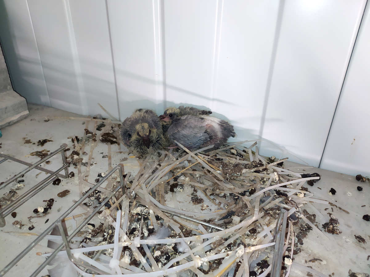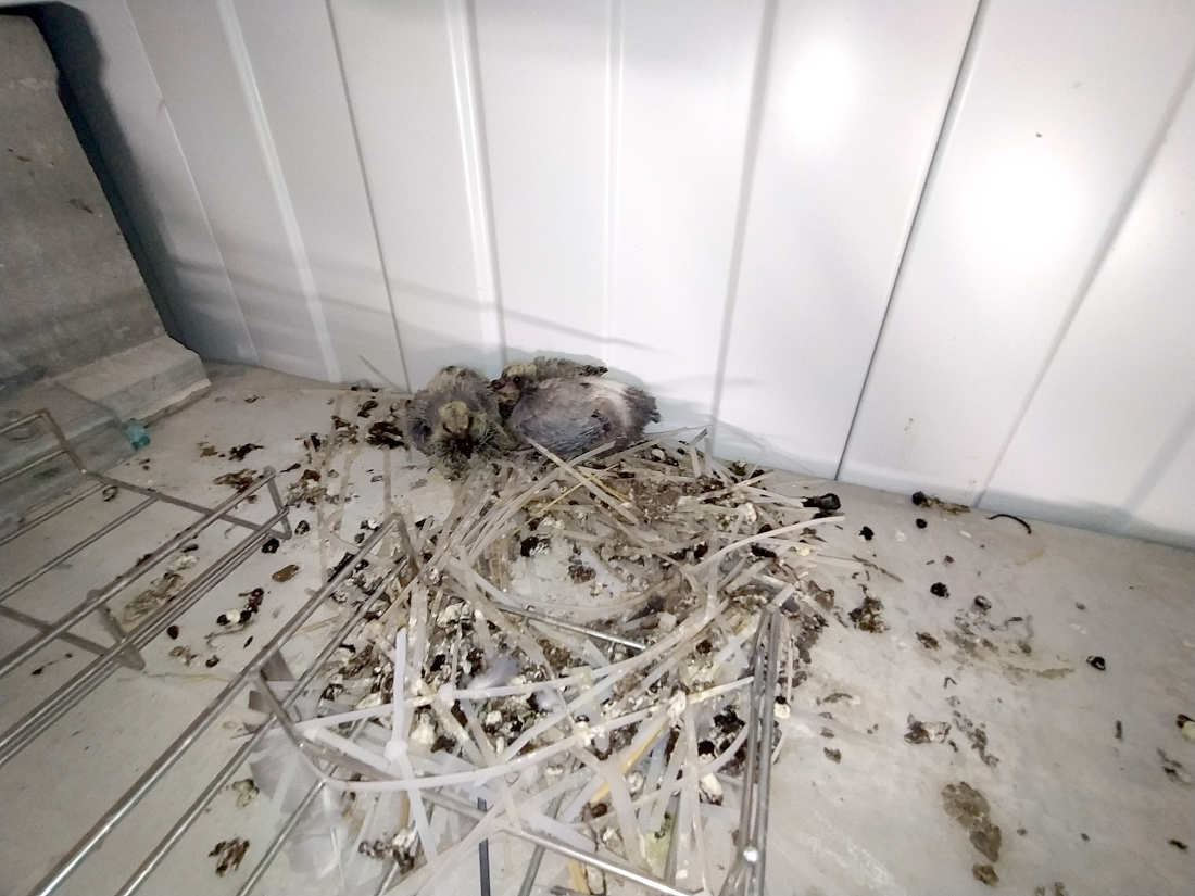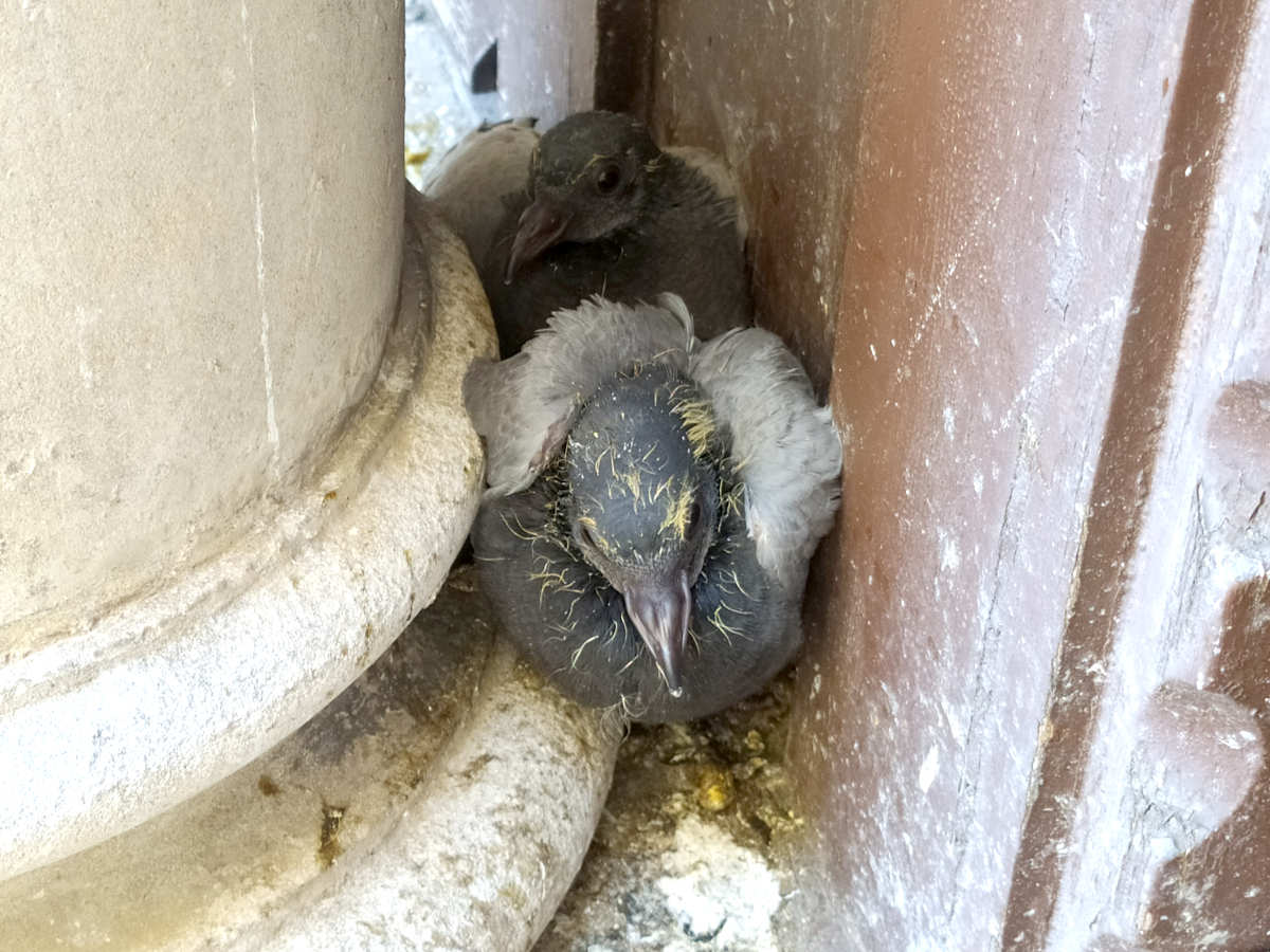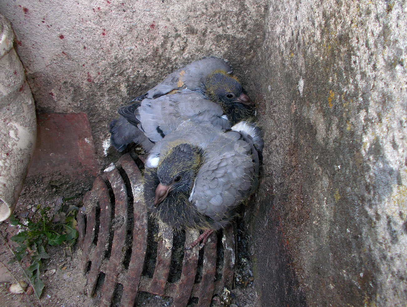 La paloma bravía (Columba livia) tiene su principal período de cría de marzo a mayo en esta zona de la Península Ibérica en donde vivo. Aunque si tienen unas condiciones adecuadas, pueden hacerlo durante todo el año. Me he encontrado con los dos primeros pollos del año. Fue retirado un nido de paloma de un lugar en el que molestaba. Había tres pichones. Pero al retirarlo, cayó uno y murió. No supieron qué hacer con los dos supervivientes y los pusieron en la esquina de un patio. Aproveché la situación para tomar unas fotografías y grabar un vídeo. Un detalle interesante es que al acercarme a los pollos se asustaron y movieron sus alas. Y esto provocó que aparecieran entre sus plumas algunas moscas de las palomas (Pseudolynchia canariensis). Este detalle lo he incluido en el vídeo que he editado con lo que grabé. Dura un minuto. En el segundo 30 se puede ver cómo sale una mosca de detrás del cuello.