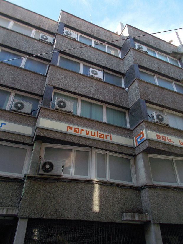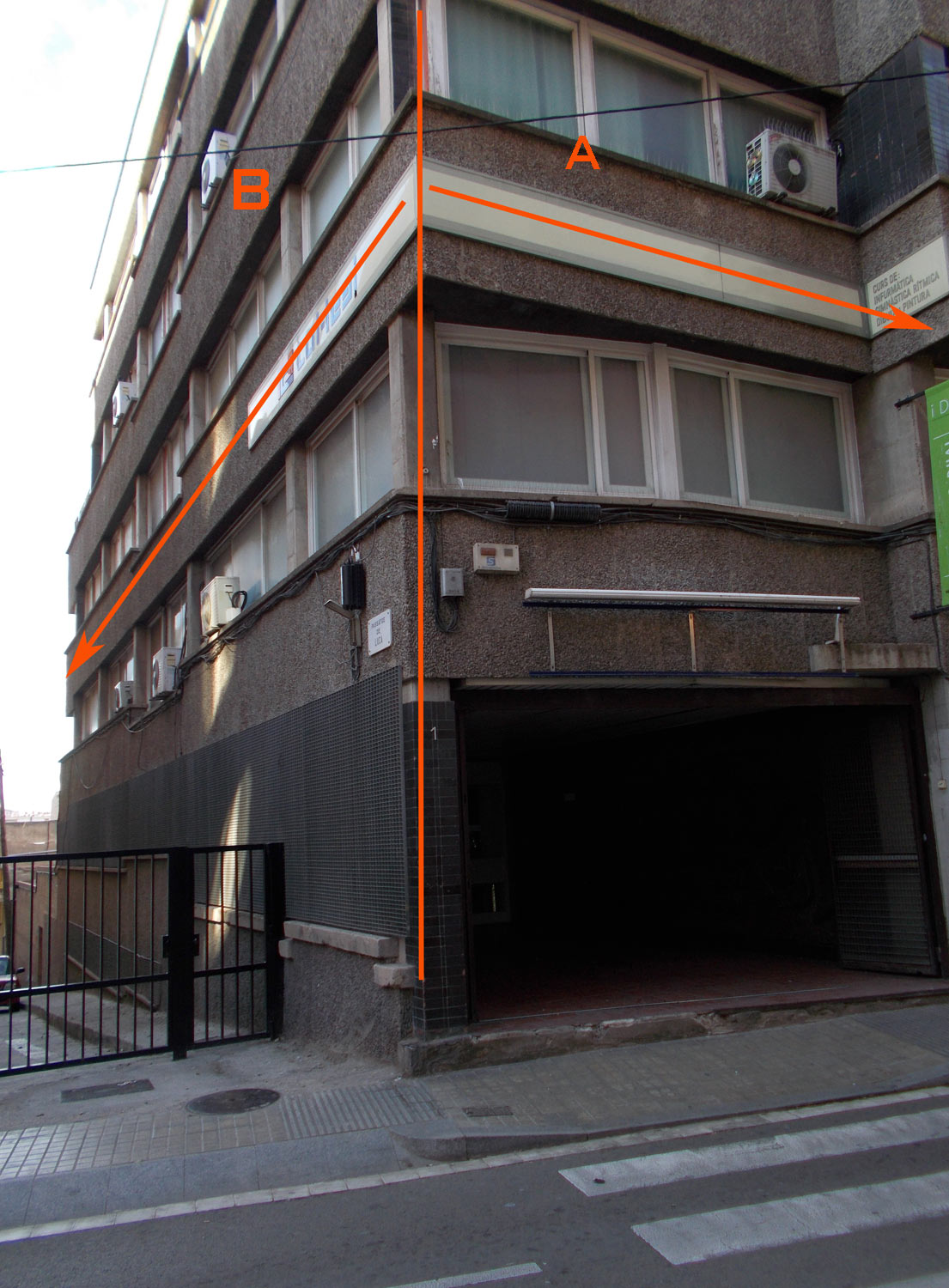 En la imagen número 1, se puede ver la fachada de un edificio destinado a educación. Una escuela. La línea roja marcada sobre la imagen separa la fachada en dos secciones. Por una parte, hay una sección que he nombrado como A, que está orientada a una calle por la que circulan coches. Por otra, está la sección B que da a un pasaje particular cerrado al tráfico. En la imagen número 2, se puede ver otra imagen de la fachada. Pues bien, el sistema antipalomas a base de pinchos tan solo está colocado sobre la sección A. Es decir, que tan solo se ha protegido la parte que da a la calle por donde pasan personas. Es evidente que se quiere proteger a estas de los excrementos. Aunque quizás el presupuesto tuviera un montante elevado y se decidieron por hacer lo justo.