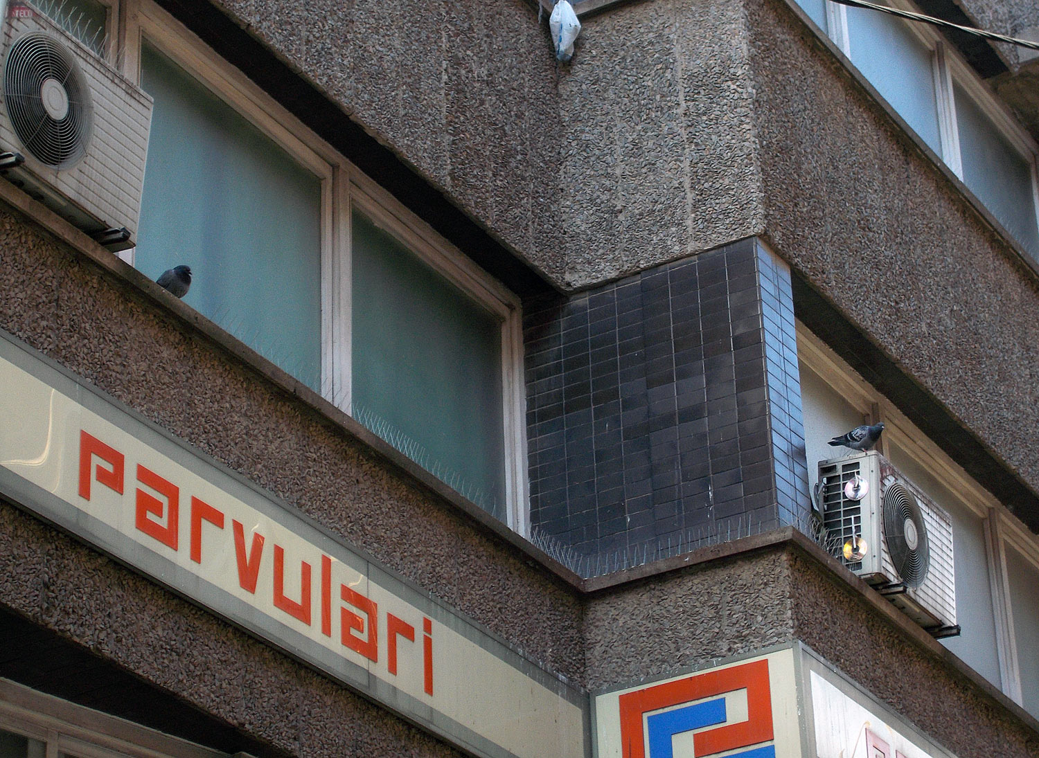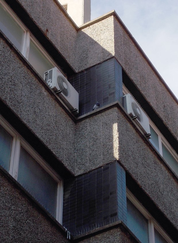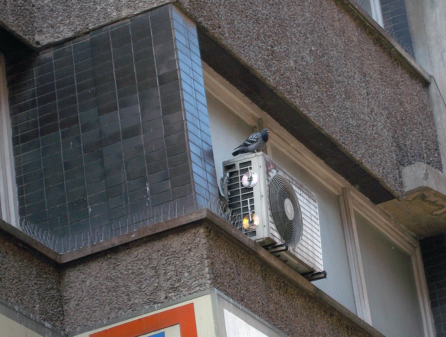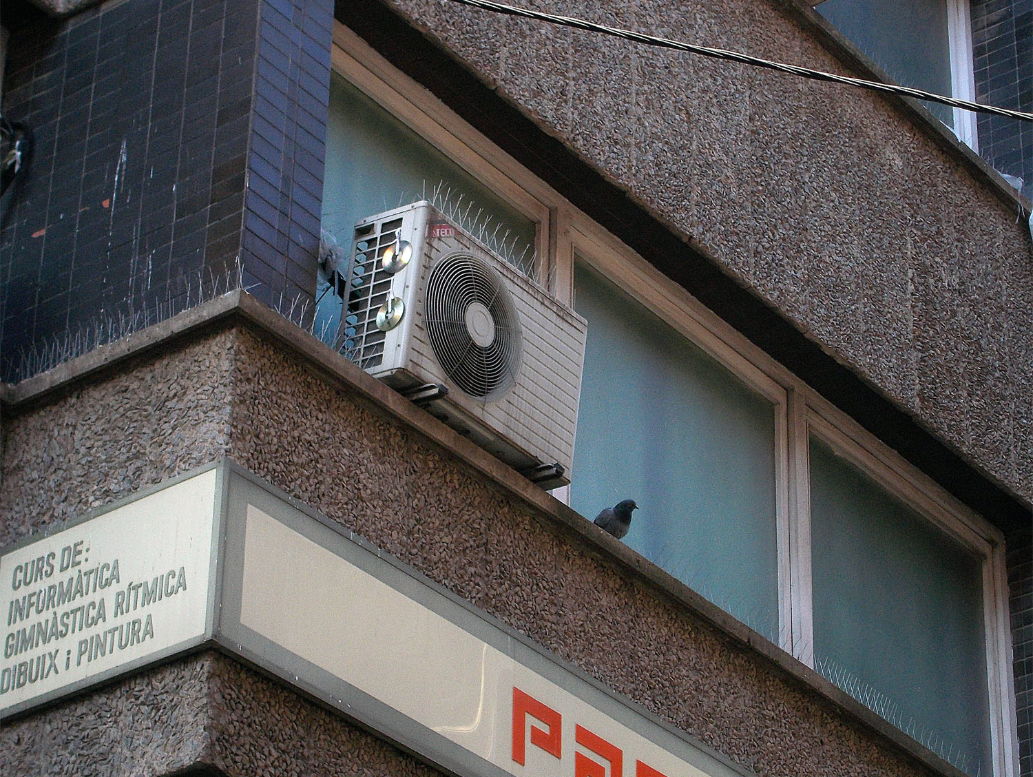 En las imágenes siguientes, se pueden ver palomas posadas en la sección A de la fachada. Esto puede haber pasado porque con el tiempo los pinchos se han desprendido. Puede que también haya sido algún despiste y se olvidaran de instalarlo en algún punto o no lo instalaran bien. Sucede con los pinchos que deben cubrir bien la zona a proteger, de lo contrario la paloma lo burla. Si una repisa es ancha, posiblemente haya que instalar un par de líneas de pinchos. Si se instala en el borde de la repisa una línea de pinchos y no se protege la parte interior, las palomas aprovecharán el hueco. En el edificio de las fotografías, había un punto que no parece fácil de proteger. Como se puede ver en la imagen número 3, la fachada aparece llena de compresores de aire acondicionado. Imagino que habrá uno por aula. Detrás de algunos vi salir palomas. Lo cual me hace pensar que aprovecharán ese espacio para hacer el nido y criar.