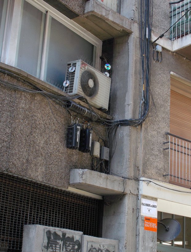 Para acabar, comentar que colocar discos compactos no sirve para ahuyentar a las palomas. La teoría dice que hay que colgarlos de hilos y dejarlos que se muevan para que la luz incida sobre ellos y brillen. Por supuesto, los que se ven en las imágenes están pegados a los compresores de aire acondicionado. También quiero comentar que el sistema que me gusta es el de hilos por ser más discreto.