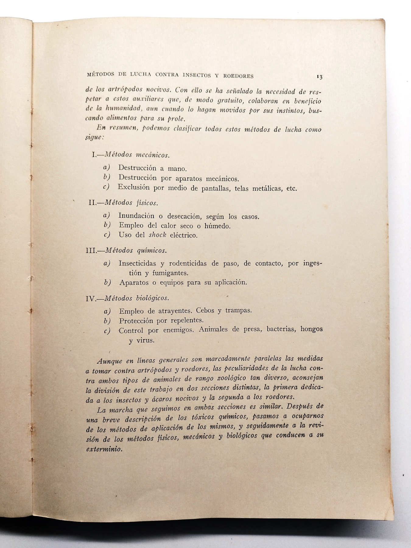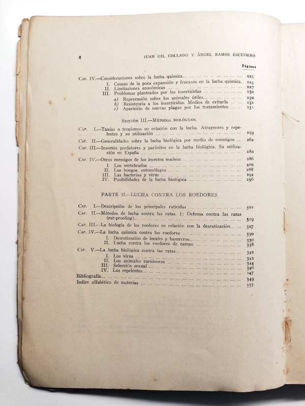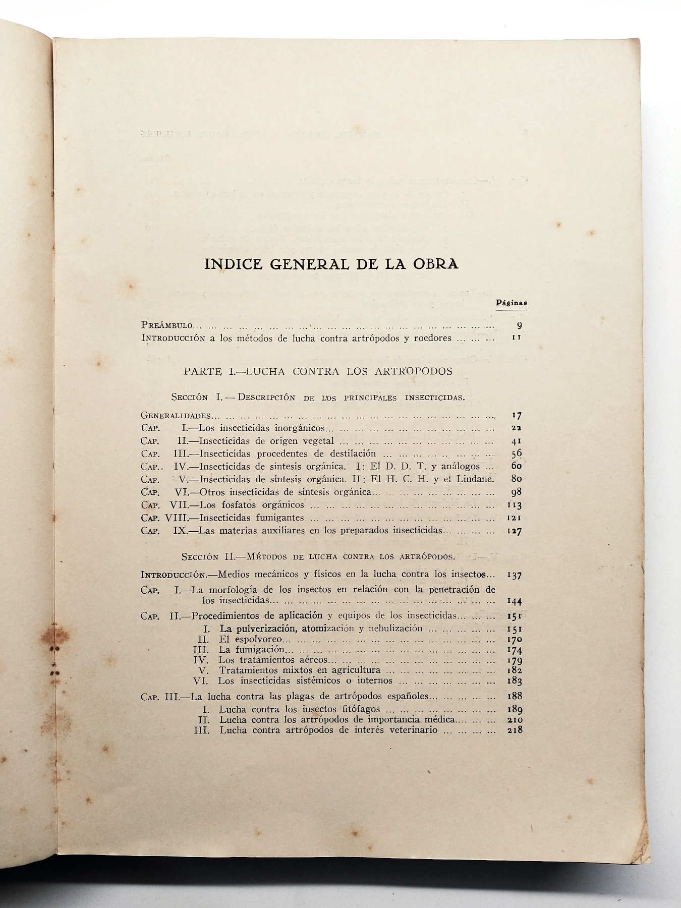 En las imágenes 2 y 3 aparece reproducido el índice general de la obra. Como se puede ver, son muchos los temas que se tratan. En la época en que se escribió aparecieron muchas novedades para combatir a los animales considerados plaga. La Segunda Guerra Mundial marca un punto de inflexión. Por una parte, el combate limitó el acceso a compuestos hasta entonces muy usados y desarrolló la investigación en cada país. Está el caso del pelitre que se producía principalmente en Japón. La Administración de los Estados Unidos de América vio que si entraban en guerra escasearía el pelitre (piretrinas naturales). Así que con tiempo invirtieron en el desarrollo de compuestos insecticidas alternativos. A finales de la década de 1940 fue sintetizada la aletrina, el primer piretroide creado para conseguir una piretrina más estable y persistente. Lo mismo sucedió con los raticidas, ya que en aquel país se utilizaba mucho la cebolla albarrana y la contienda ponía en peligro su suministro. Como resultado se desarrolló el antu y el castrix. Por otra parte, en la década de 1940 aparecieron nuevas moléculas insecticidas como los de la familia organoclorada: DDT, HCH, clordano, toxafeno, heptacloro, aldrín y dieldrín. Y en esa década fueron desarrollados los dos primeros anticoagulantes dicumarol y warfarina.
