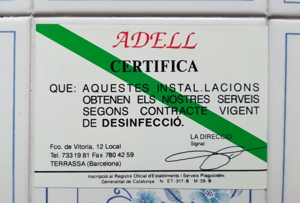 Fig 8. Certificado de garantía de la empresa Adell (Terrassa)./ Desinsectador 2018