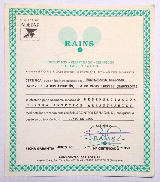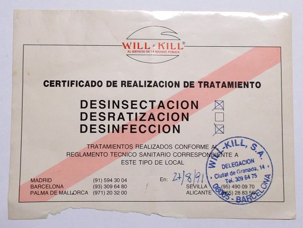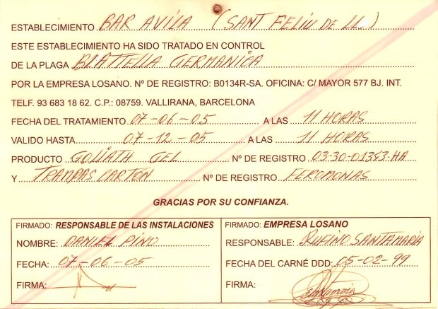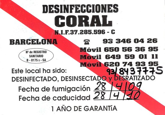 Espero que se entienda que la mención a Desinfecciones Coral es porque se trata de un tipo de empresa que considero que no se ha adaptado a los nuevos tiempos y al control integrado de plagas. De hecho, en su certificado de garantía aparece la fecha de fumigación. Técnicamente, en un bar se hace un pincelado o una pulverización. La fumigación se realiza con fosfina. En fin, el certificado este da para una tesis.