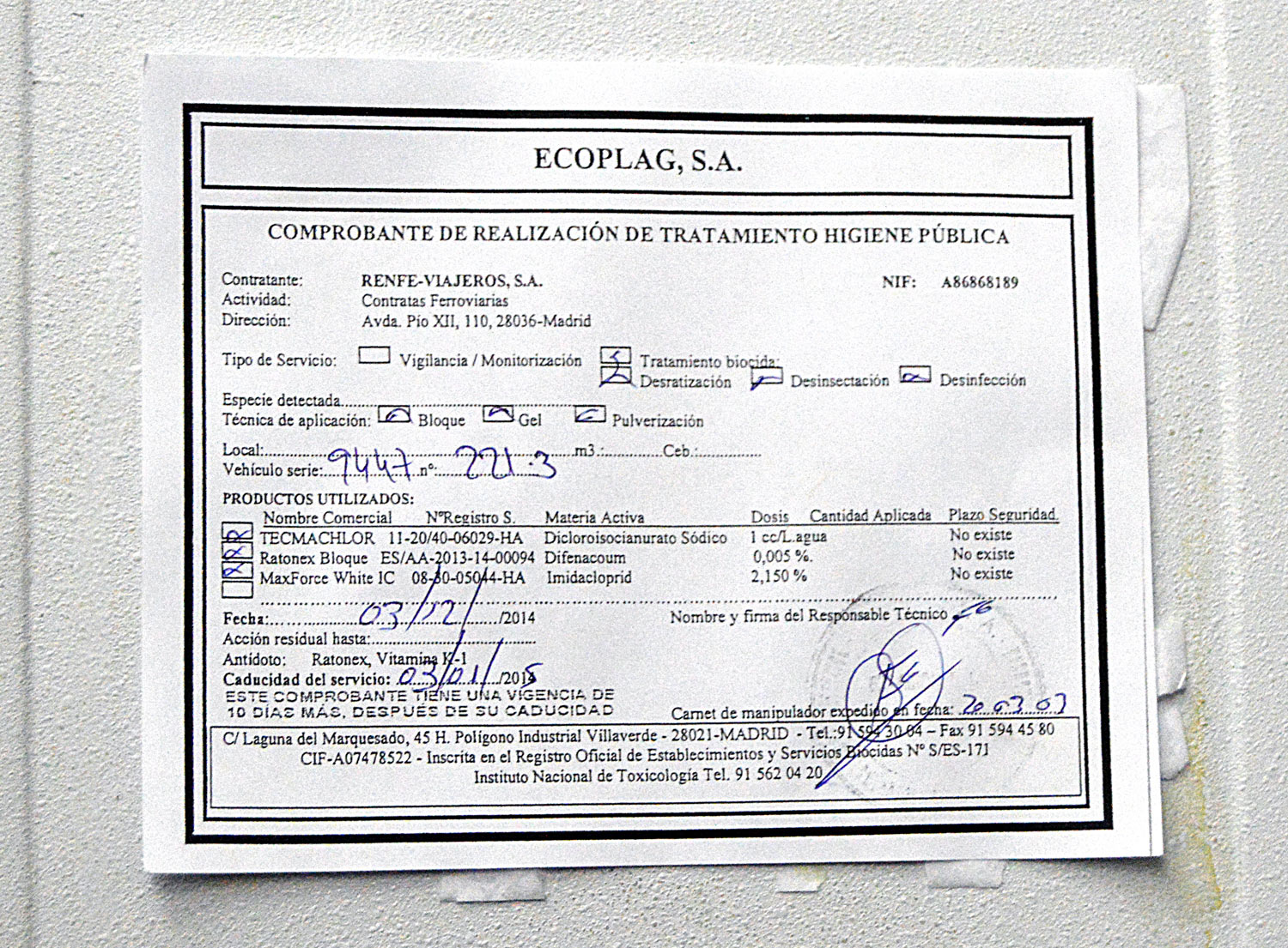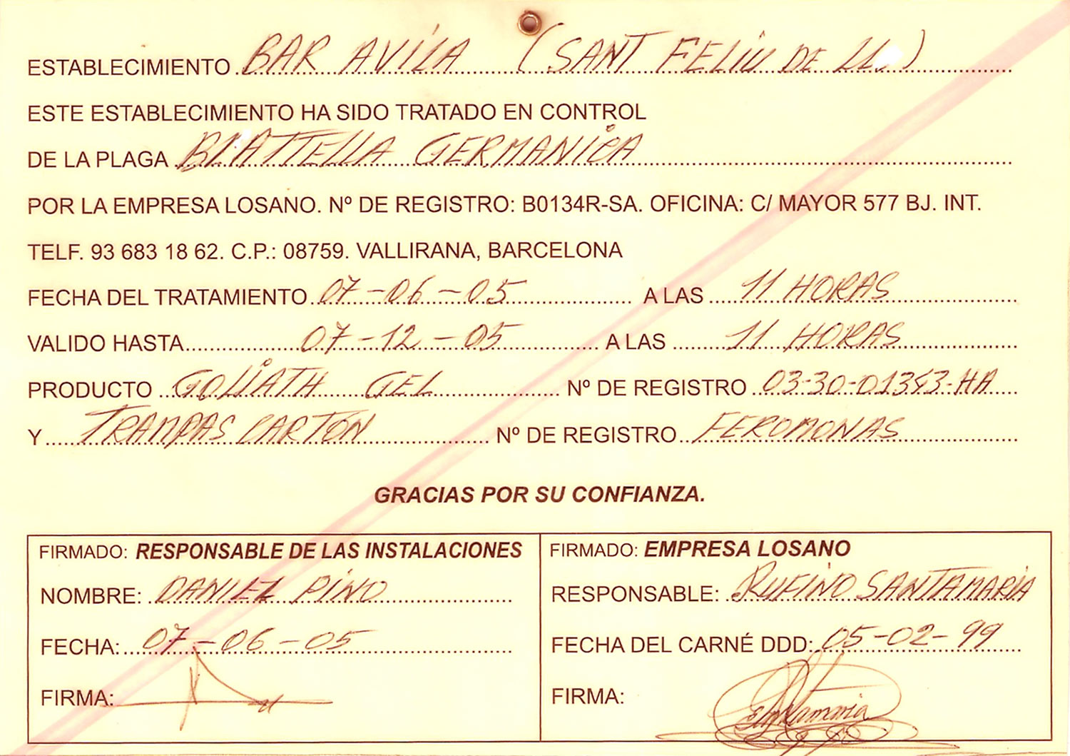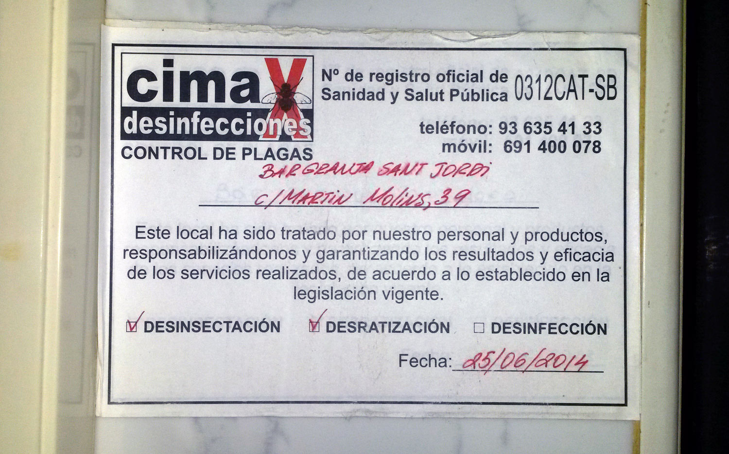 Espero que se entienda que la mención a Desinfecciones Coral es porque se trata de un tipo de empresa que considero que no se ha adaptado a los nuevos tiempos y al control integrado de plagas. De hecho, en su certificado de garantía aparece la fecha de fumigación. Técnicamente, en un bar se hace un pincelado o una pulverización. La fumigación se realiza con fosfina. En fin, el certificado este da para una tesis.