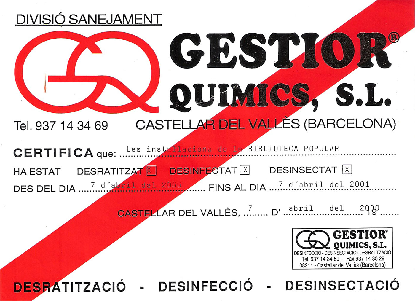 Fig 4. Certificado de garantía de Gestior Químics (Castellar del Vallès)./ Desinsectador 2015