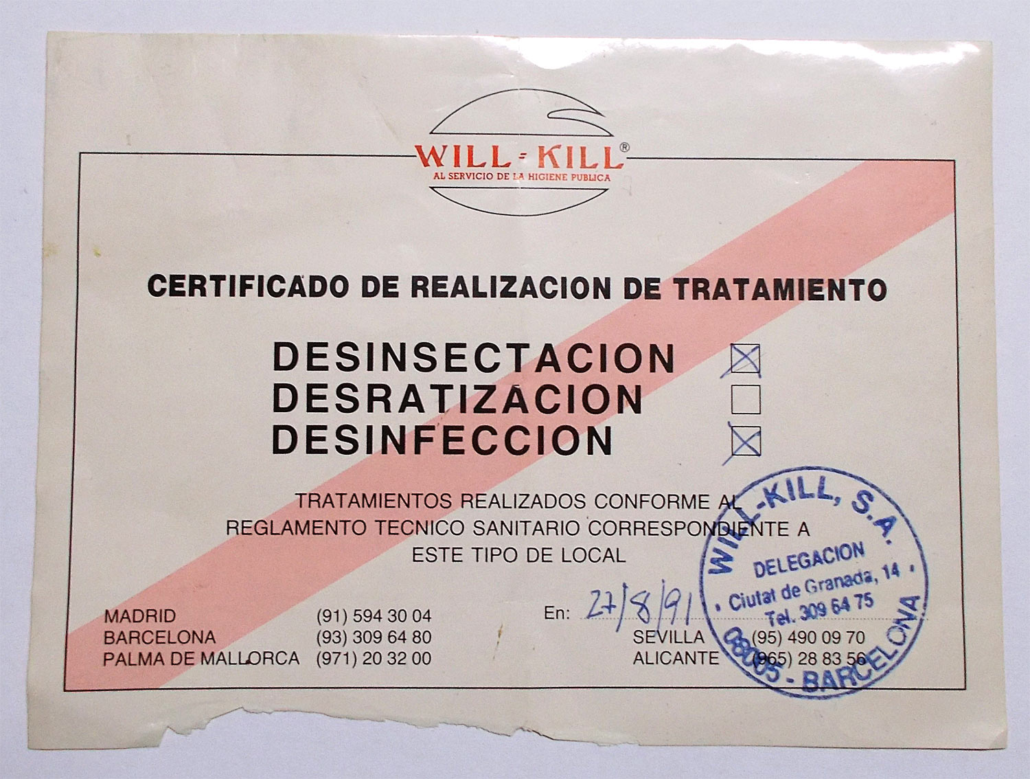 Fig 3. Certificado de garantía de Will-Kill (Barcelona)./ Desinsectador 2014