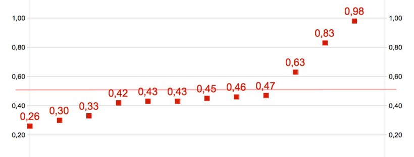 En la Tabla I aparecen listados 19 geles contra cucarachas disponibles para este 2015 [1]. Creo que he recogido los más importantes para uso por personal especializado. Un aspecto importante es el precio. Con 13 de estos he elaborado la Gráfica I para poder establecer una comparativa. En la tabla se indica el precio por gramo de cada uno de estos geles [2]. Están ordenados desde el más barato, a la izquierda, hasta el más caro, a la derecha. La línea roja horizontal marca el precio medio que es de 56 céntimos de euro por gramo. Esta divisoria deja 9 geles por debajo y 4 por encima. Es interesante ver que estos 4 geles que están por encima se desmarcan bastante del precio medio.