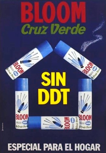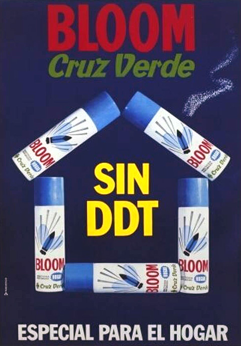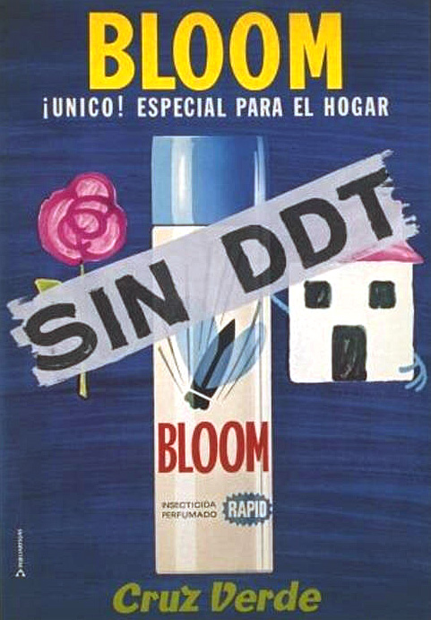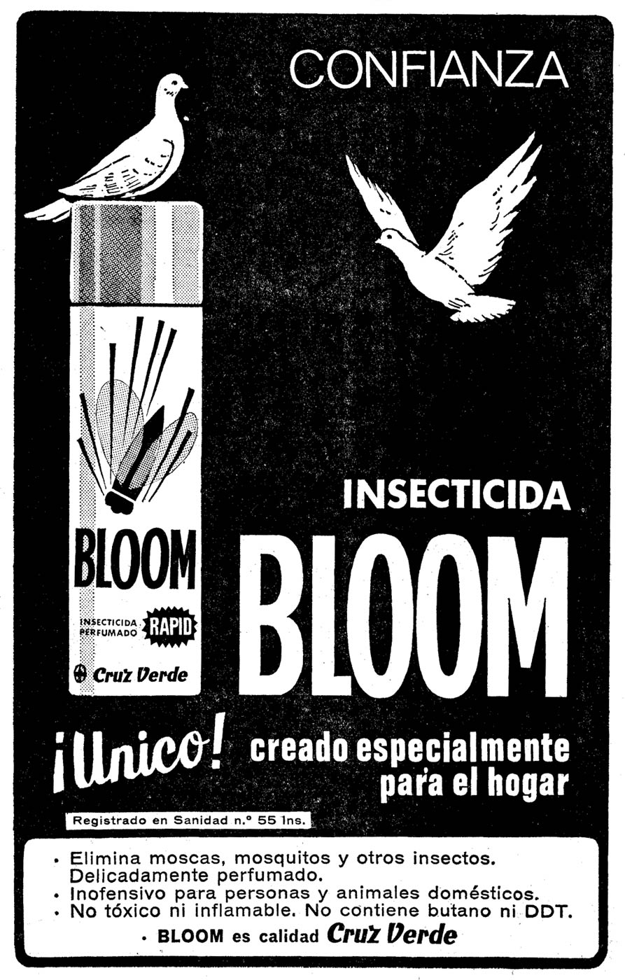 A finales de la década de 1960, el DDT empezó a tener mala prensa. La población fue informada de todos los problemas que había conllevado un uso tan intensivo y extensivo que se había hecho desde 1945. De hecho, Cruz Verde nació en ese año para comercializar insecticidas a base de este compuesto organoclorado. Con el cambio de mentalidad, había que desmarcarse del DDT y Cruz Verde hizo constar que sus productos para uso doméstico estaban libres. En 1970 apareció una nueva campaña en prensa escrita en la que un par de palomas volaban junto a un bote de Bloom. Recordemos que en aquella época se acusó al DDT de ser el culpable de la disminución de rapaces, ya que la bioacumulación en el cuerpo de estas hacía que los huevos se formaran con una cáscara más delgada. Bloom debía aparecer como un producto seguro para las personas y para el medio ambiente.